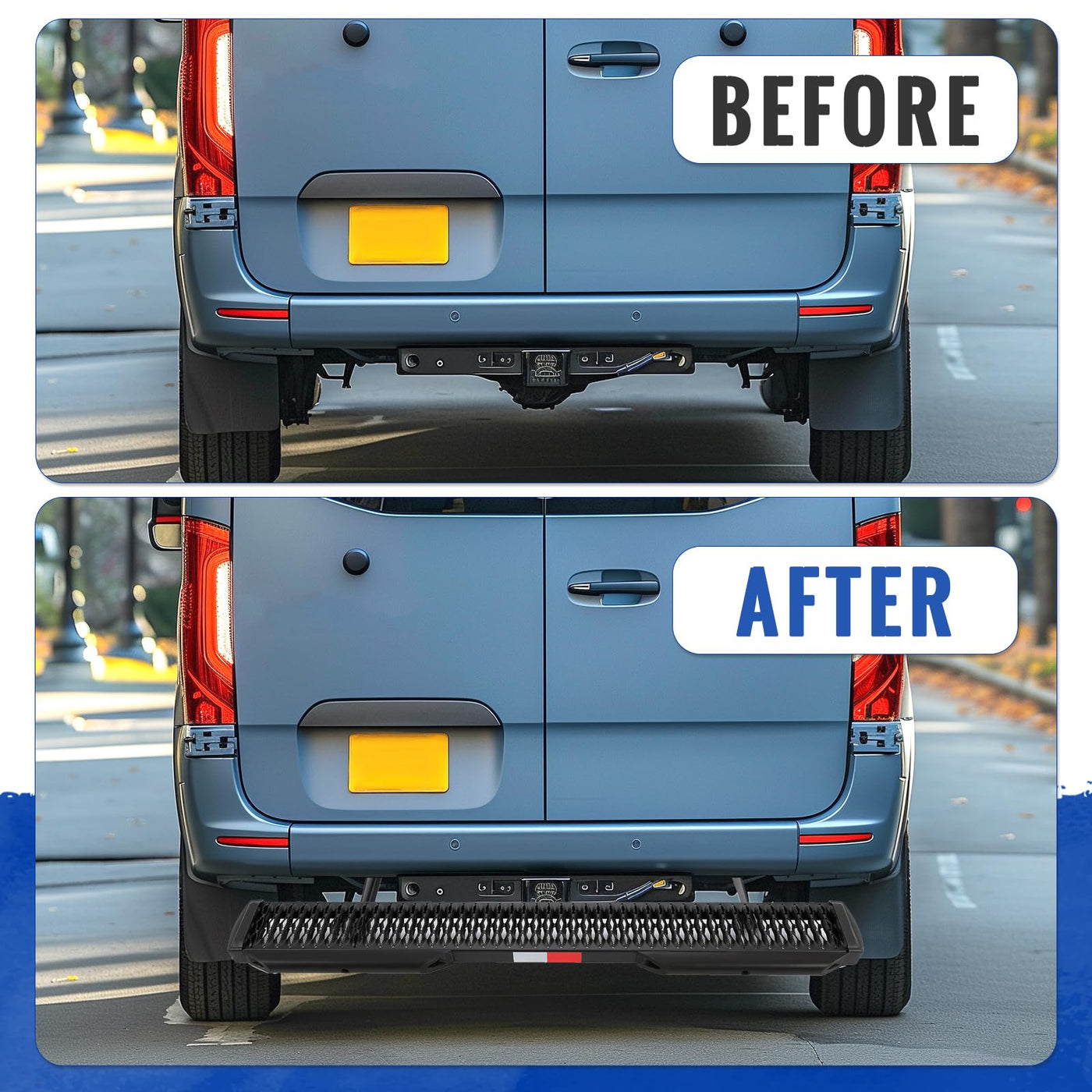 [ Compatibility ] The Rear Step Kit is compatible with 2007-2023 Mercedes-Benz Sprinter 1500 2500 3500 3500XD 4500. [ Facilitate Your Life ] It is mounted under the bumper at the rear of the vehicle to provide safer and easier access to and from the cargo area. Improves efficiency of cargo delivery. [ Excellent Quality ] Made of hardened steel with a durable black powder coating on the surface to extend its life. Withstands all kinds of bad weather and provides you with excellent traction and safety. [ Package Listing ] 1* Rear Step Kit (Mounting Brackets, 54'' Step Running Board, Dock Bumpers, Reflective Tape). Includes installation accessories but not instructions. [ Installation ] Bolt on mounting. Vehicle-specific brackets make installation easy and fast.