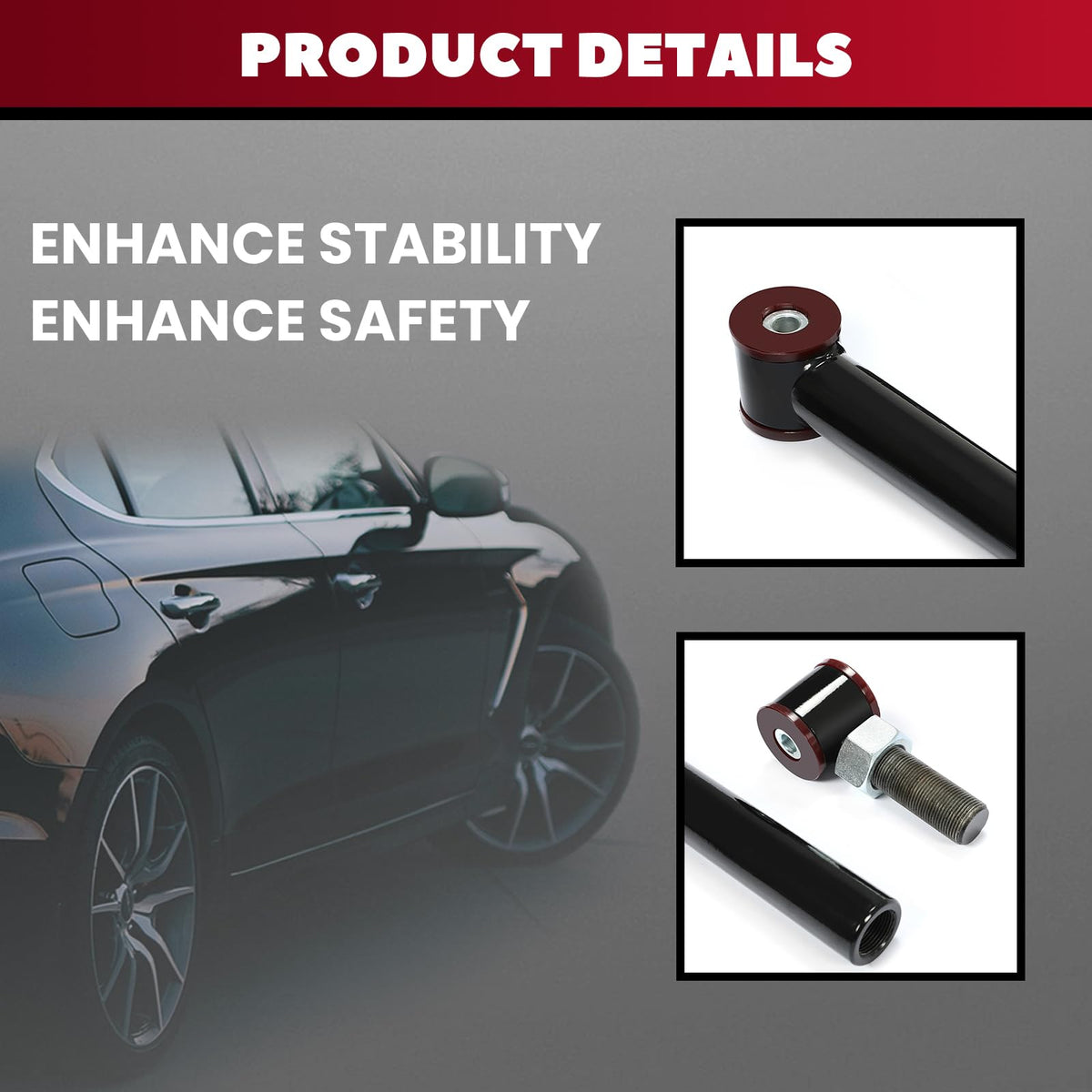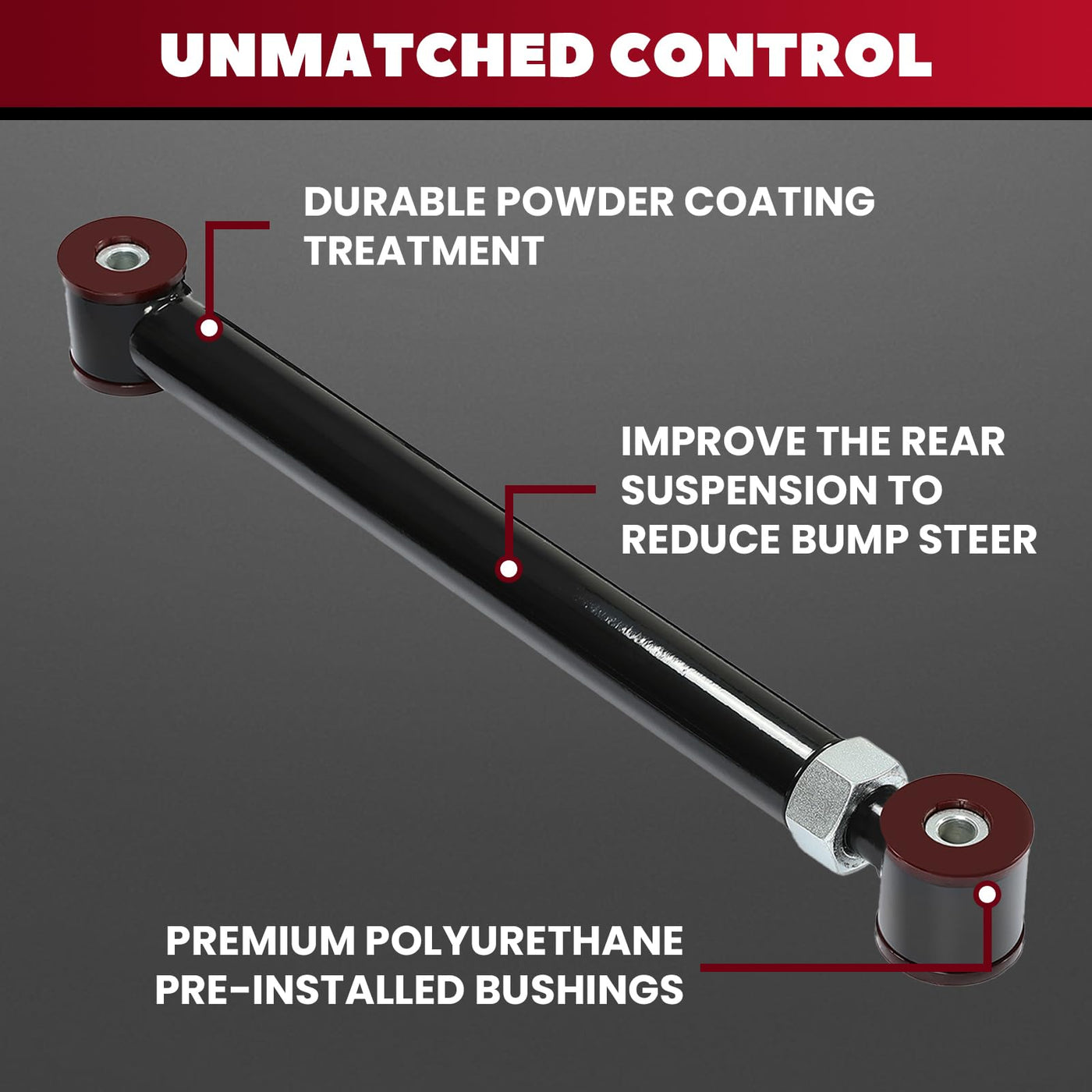 Q: What materials are used in the construction of these control arms?A: The control arms are made from heavy-duty alloy steel, featuring a tubular design with pre-installed bushings for added strength and durability.