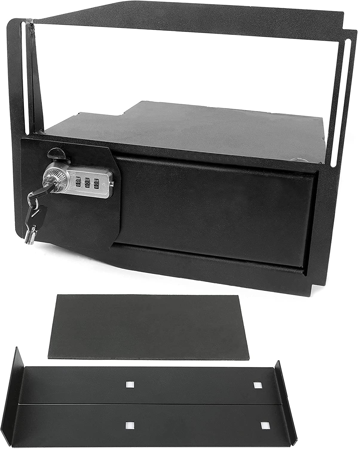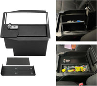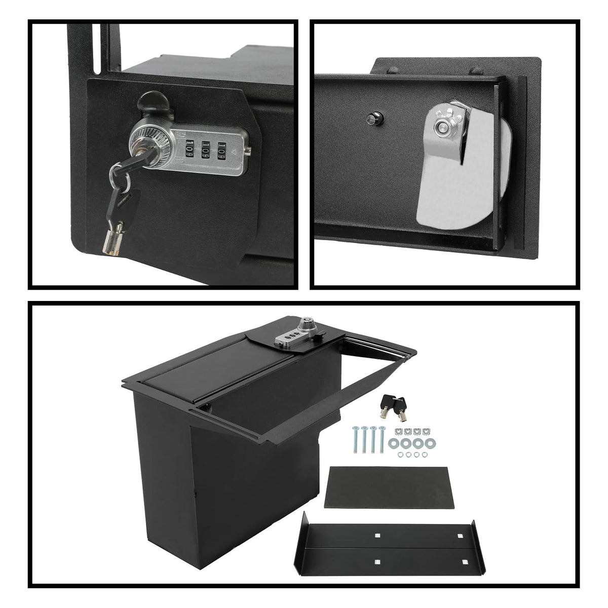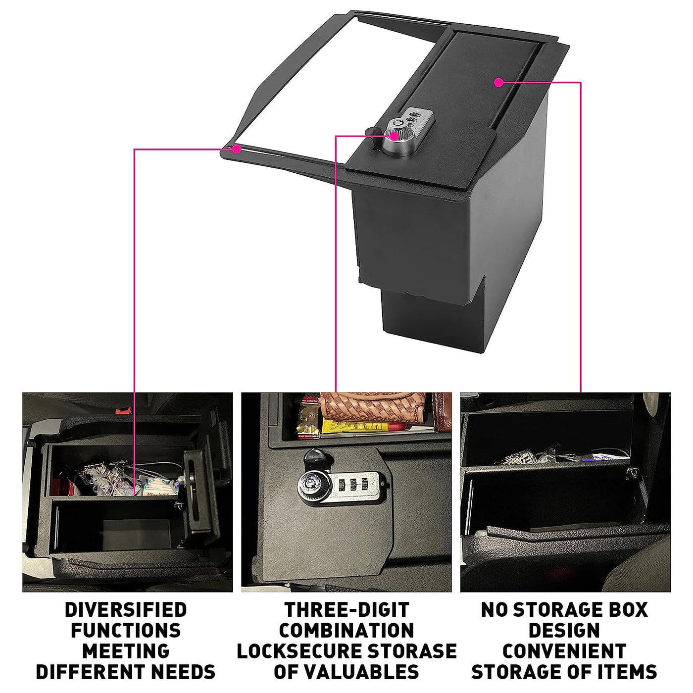 Center console gun safe storage box, will be compatible with 2015-2022 Ford F-150/Raptors; Also compatible with 2017-2020 Ford F-250/F-350 Super Duty. NOTE: This safe fits the trucks with center consoles only. Does NOT fit bench seat models. Made from first class steel, with more solidity. Powder coated surface prolongs the lifespan. Center console safe storage box, features fully welded locking components, concealed anti-pry hinges and 3 Digit Personal combination with key backup. Package includes backup keys. Provide convenience to protect your valuables and firearms from auto theft. Straightforward bolt-on installation with accompanying hardware kit, instruction is included. Installation requires no modifications to the vehicle's factory console.