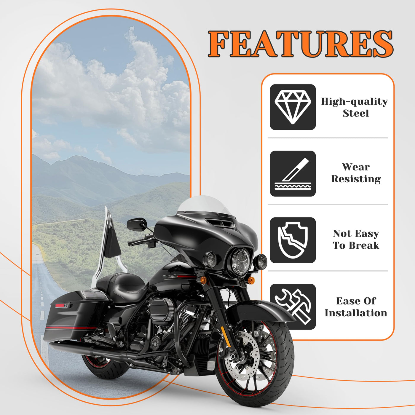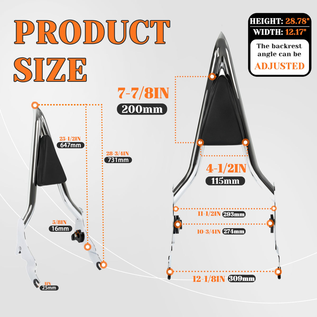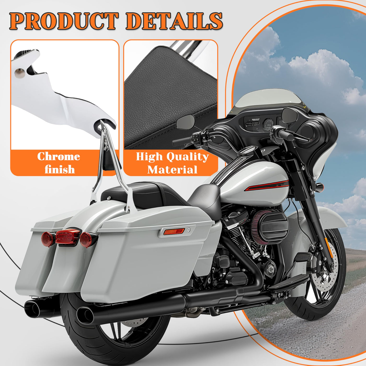 HECASA Detachable Backrest Sissy Bar Luggage Rack Compatible with 2009-2024 Harley Touring Models CVO Road Glide/Road King Powder Coated+Electrophoresis Surface 22 Inches Chrome Fitment: Detachable, with Backrest 22 Inches Chrome Sissy Bar Compatible with 2009-2024 Harley Touring Models CVO Road Glide, Road King, Road Glide, Street Glide, Electra Glide, Ultra Limited, Ultra Limited Low. Features: Color: Chrome. Material: Steel+Leather. Surface Finish: Chrome + Electrophoresis. Made of high-quality steel, reinforced and durable, not easy to break. The chrome-plated appearance is more eye-catching. Type: Passenger Backrest. Detachable backrest with luggage rack, the backrest angle can be adjusted, you can freely adjust to a suitable position to meet different needs and improve the comfort of passengers. Installation: The installation method is the use of clip installation, convenient and simple, can be quickly installed. Bring you a comfortable motorcycle experience. Package Contents: The package includes a Backrest Sissy Bar (Chrome) with mounting fittings, mounted using clasp. With mounting accessories, accessories already installed on the product. Note: Instructions are not included.