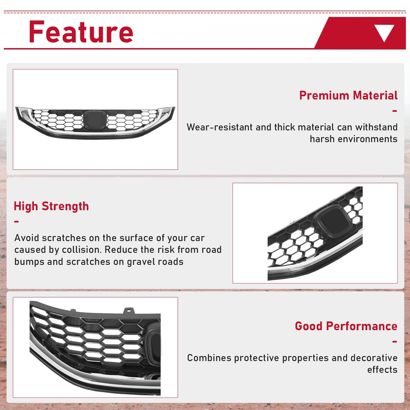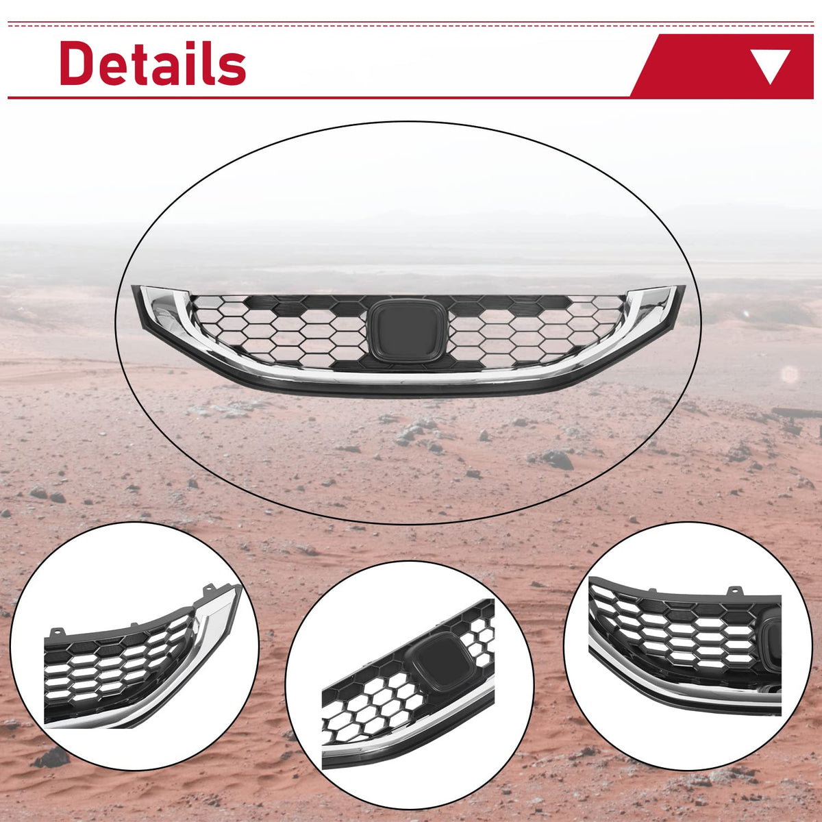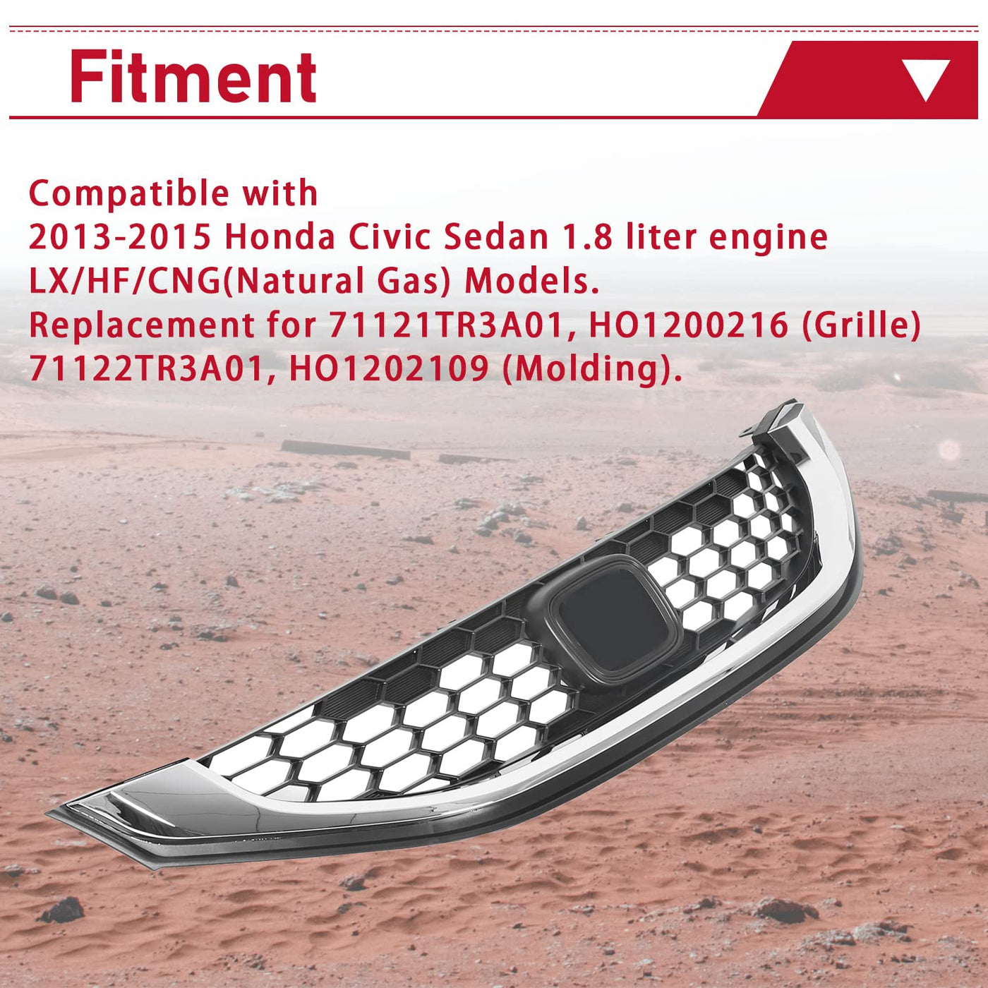 Fitment: Compatible With 2013-2015 Honda Civic Sedan 1.8 Liter Engine Lx/Hf/Cng(Natural Gas) Models. Part Number: Replacement For 71121Tr3A01, Ho1200216 (Grille) 71122Tr3A01, Ho1202109 (Molding). Feature: Color: Black + Chrome; Material: Made Of High Quality Abs Plastic, Solid And Durable. Function: The Grille Is Not Only A Core Component Of Your Vehicle, It Also Prevents Debris And Harmful Substances From Damaging Radiators, While Allowing Air To Pass Through And Keeping The Engine Cool. In Addition, The Grille Gives Your Vehicle A Handsome Looking And Makes Your Car Stand Out From The Crowds. Package Included: One Front Bumper Grille. Instruction Is Not Included!!! Easy To Install, Directly Replacement.