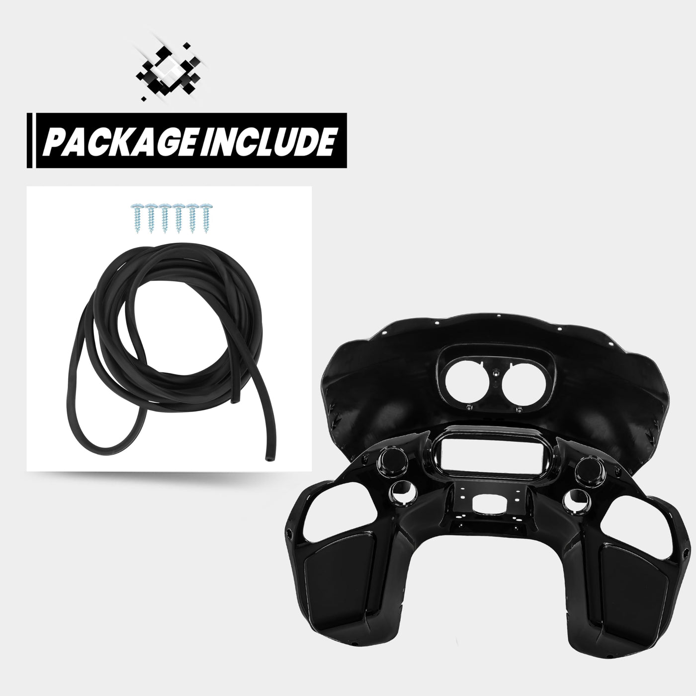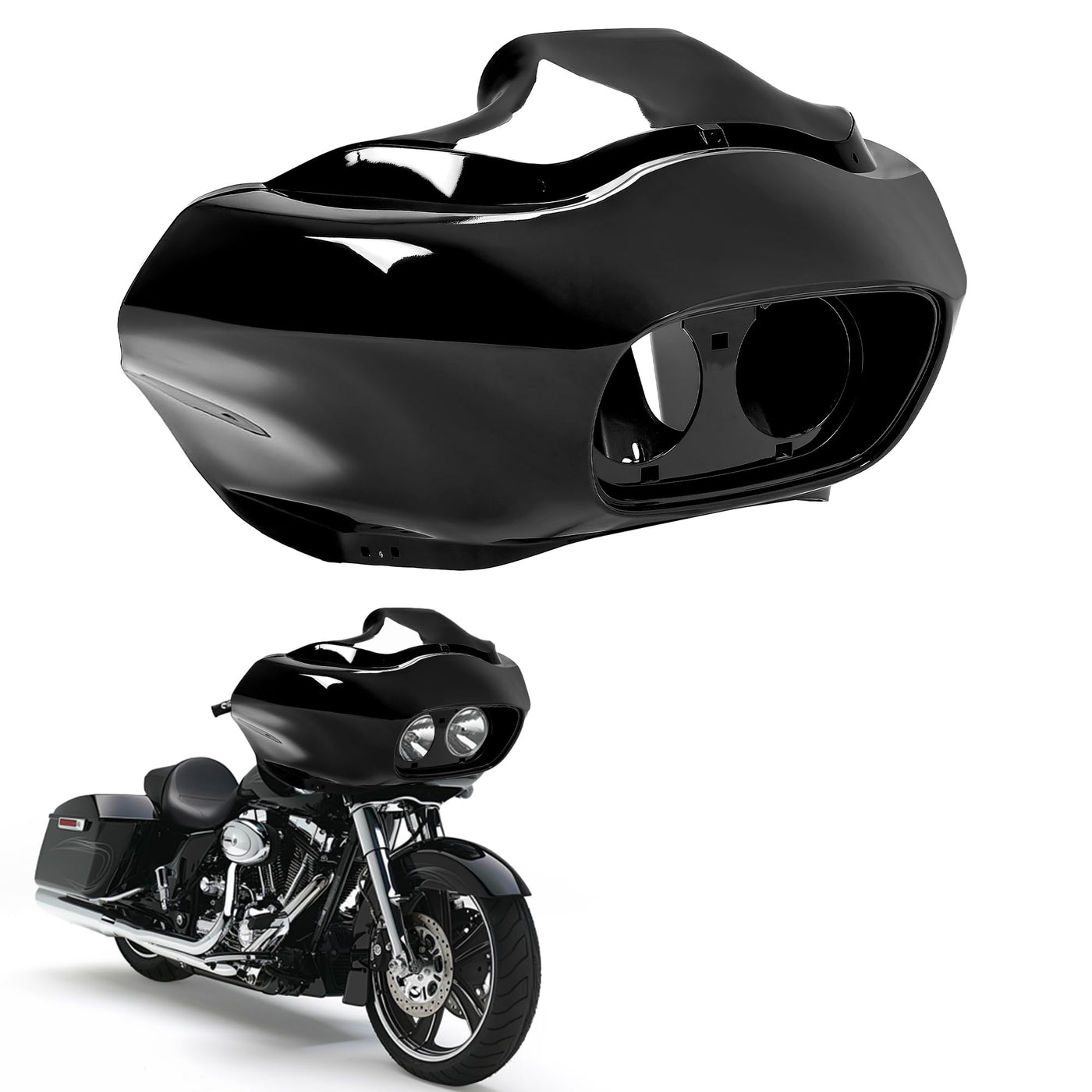 Product Compatability: This Batwing Inner Fairing and Batwing Outer Fairing kit is compatible with 1998-2013 Harley-Davidson Road Glide, please check your motorcycle's model and year carefully before purchasing. Improve Performance: By guiding the airflow around the rider, this will reduce the turbulence and vibration, improve rider comfort and stability while reducing noise when at high speed. In addition, the two tool boxes on each right and left side provide the space for you to store things. The high strength plastic material will make outer and inner fairing not easy to damage. Feature: If you face bad weather when outside, such as wind and rain, the batwing fairing kit will help the motorcycle dashboard from wind and rain. Overall design: Greatly reduce the windward area of the motorcycle and reduce air resistance during driving. After you install this, it will not affect the range of headlight illumination of motorcycle. By the way, the fully glossy black design will enhance the appearance and style of your motorcycle. .Package & Installation: 1 set of Batwing Inner Fairing & Batwing Outer Fairing (With hardware but no instruction). Pre-made threaded holes for easy to attach the inner fairing.
