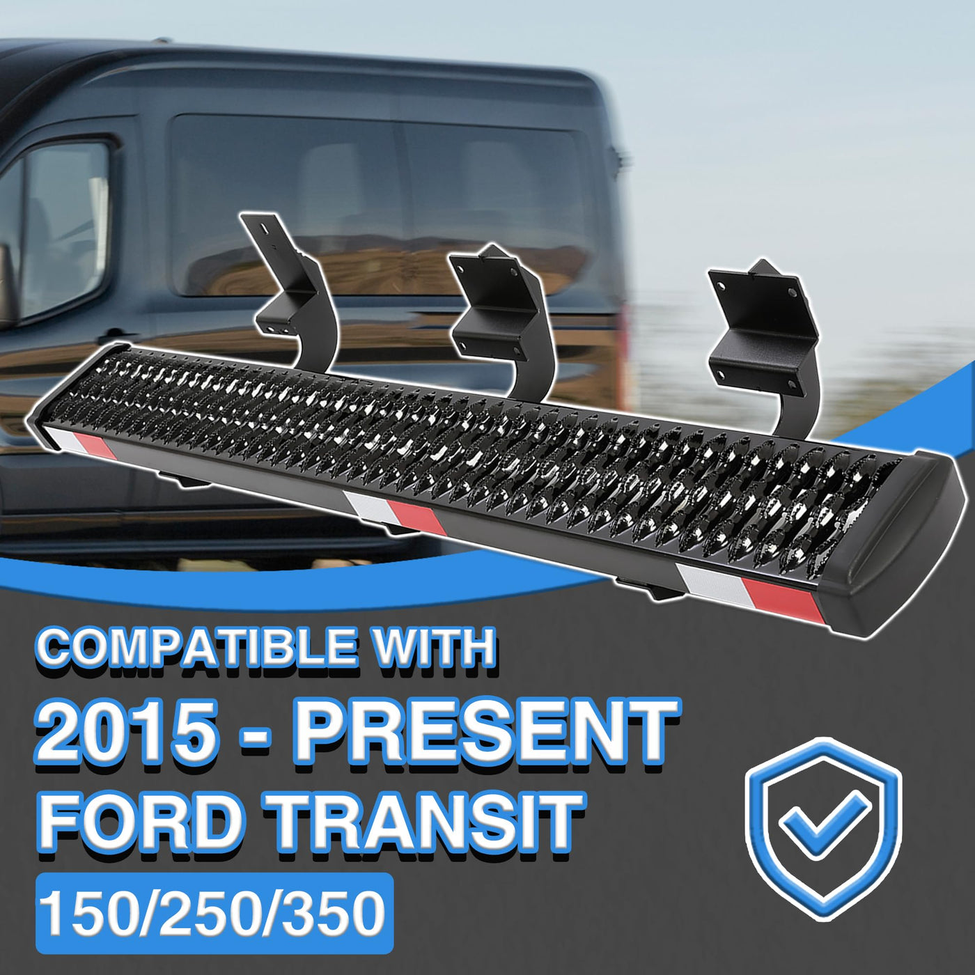 Fitment: The cargo van step compatible with 2015 To Present Ford Transit 150/250/350. Enhanced accessibility: The side step provides easy access to the vehicle, with a sturdy and slip-resistant platform that allows passengers to enter and exit safely. This is particularly useful for those with mobility issues or for those who frequently carry heavy loads. Superior construction: Made from high-quality material, including durable steel and powder coatings, the grip step is built to last. It can withstand the toughest use and weather conditions, ensuring reliable performance over time. Improved safety: The van step features a non-slip surface that provides extra traction, even in wet or slippery conditions. This reduces the risk of slips and falls and improves overall safety for passengers and drivers alike. Easy installation: The running board is designed for easy installation, with a simple bolt-on design that requires minimal tools and no drilling or cutting. Include Grip Step X1, Instructions and Mounting Accessories.