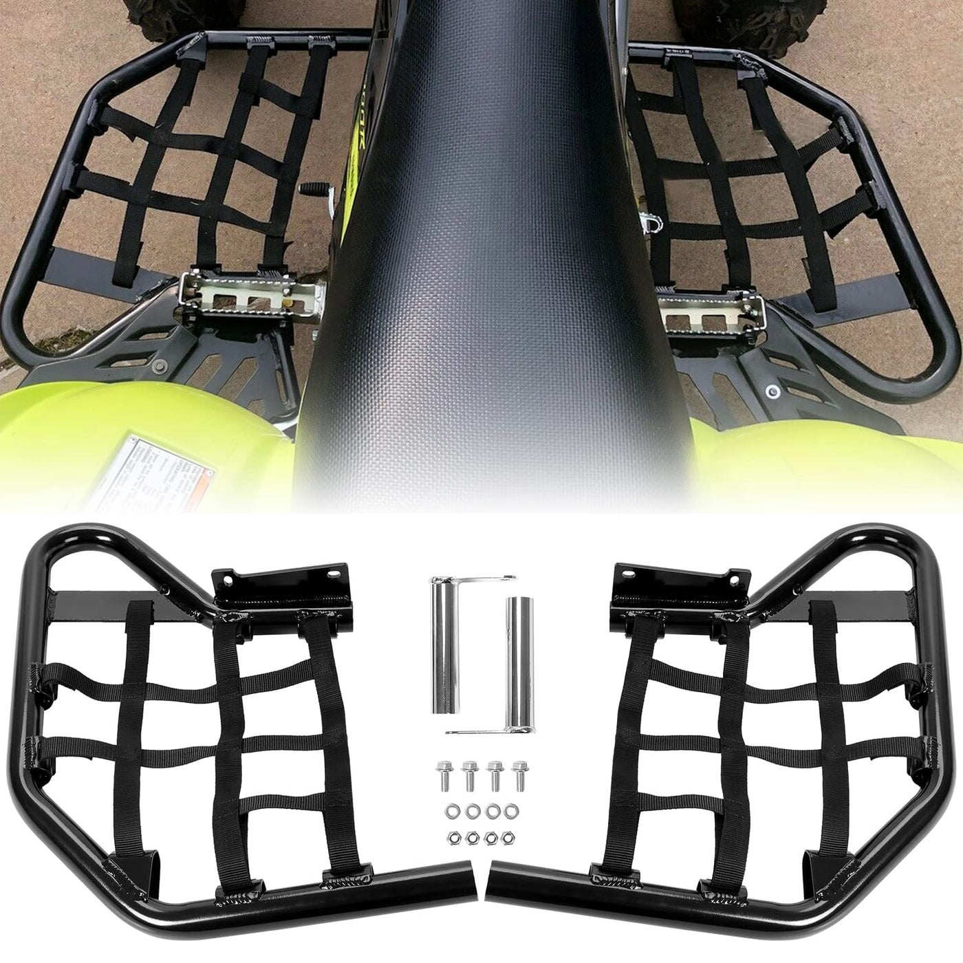 Product Adaptation - Nerf Bar Compatible with All Years Yamaha Raptor 700 YFM 700 YFM700 YFM700R. Diverse Functions - They help keep other riders' wheels away from your legs or boots when you're in a collision, preventing a hazard. Should your boots slip, the kick-up footrests are a great way to keep your boots from slipping out and also provide you with a point of leverage when cornering. Exquisite Craftsmanship - Constructed of 1 3/8'' diameter aluminum tube, the surface is smoother after treatment, and various colors bring a different style. The nerf bars are high strength powder coated and then polished for impact resistance that will have long using life. Package Included - A pair of black side steps with black webbing nets. Instructions are not included. Installation accessories are included. Easy to install, you can bolt on directly, no modifications are needed. Notes: Please check your ATV model carefully to confirm in advance whether it is suitable for this nerf bar and avoid buying the wrong product.