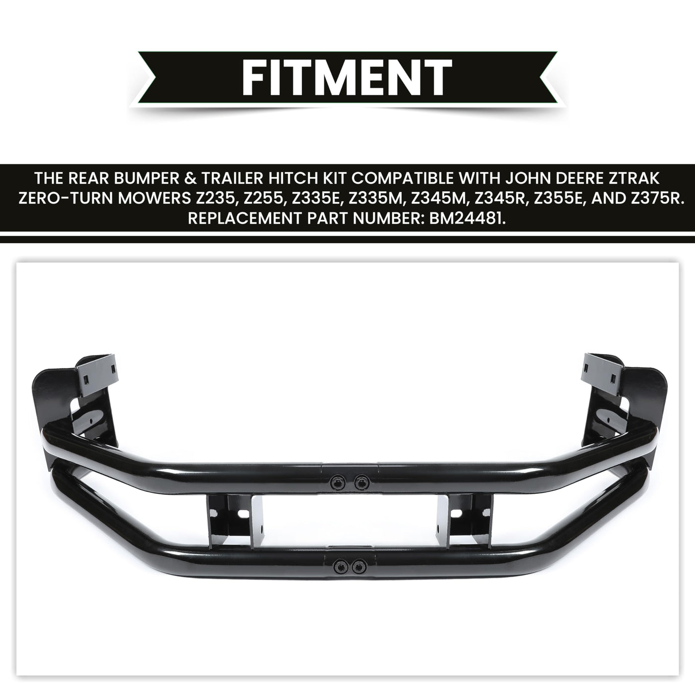 Fitment- The Rear Bumper & Trailer Hitch Kit Compatible With John Deere Ztrak Zero-Turn Mowers Z235, Z255, Z335E, Z335M, Z345M, Z345R, Z355E, And Z375R. Replacement Part Number: Bm24481. High Performance- Bumper Guard Protects The Rear From Damage, Trailer Hitch Receiver Provides Convenience For Your Towing Work, Maximal Capacity: 250 Lb (113 Kg). Condition- Made From High Quality Steel, Powder Coated Surface For Rust Protection. Package- 1 Rear Bumper & Trailer Hitch Kit. Include Necessary Mounting Hardware And Instruction. Installation- Install With Screws, We Also Recommend Professional Installation.