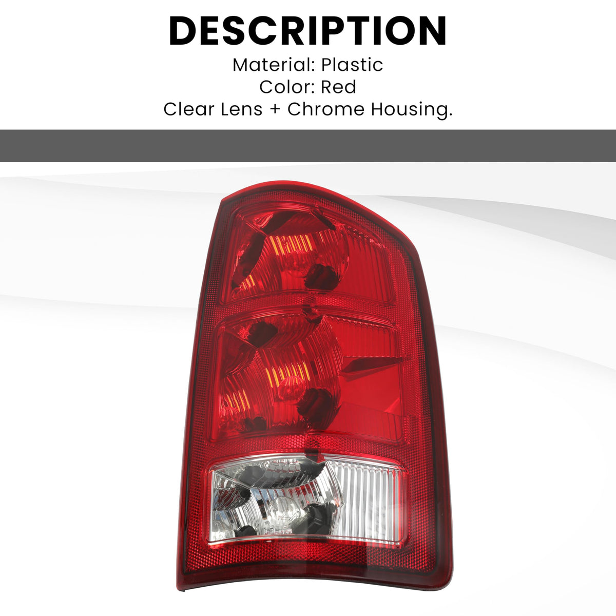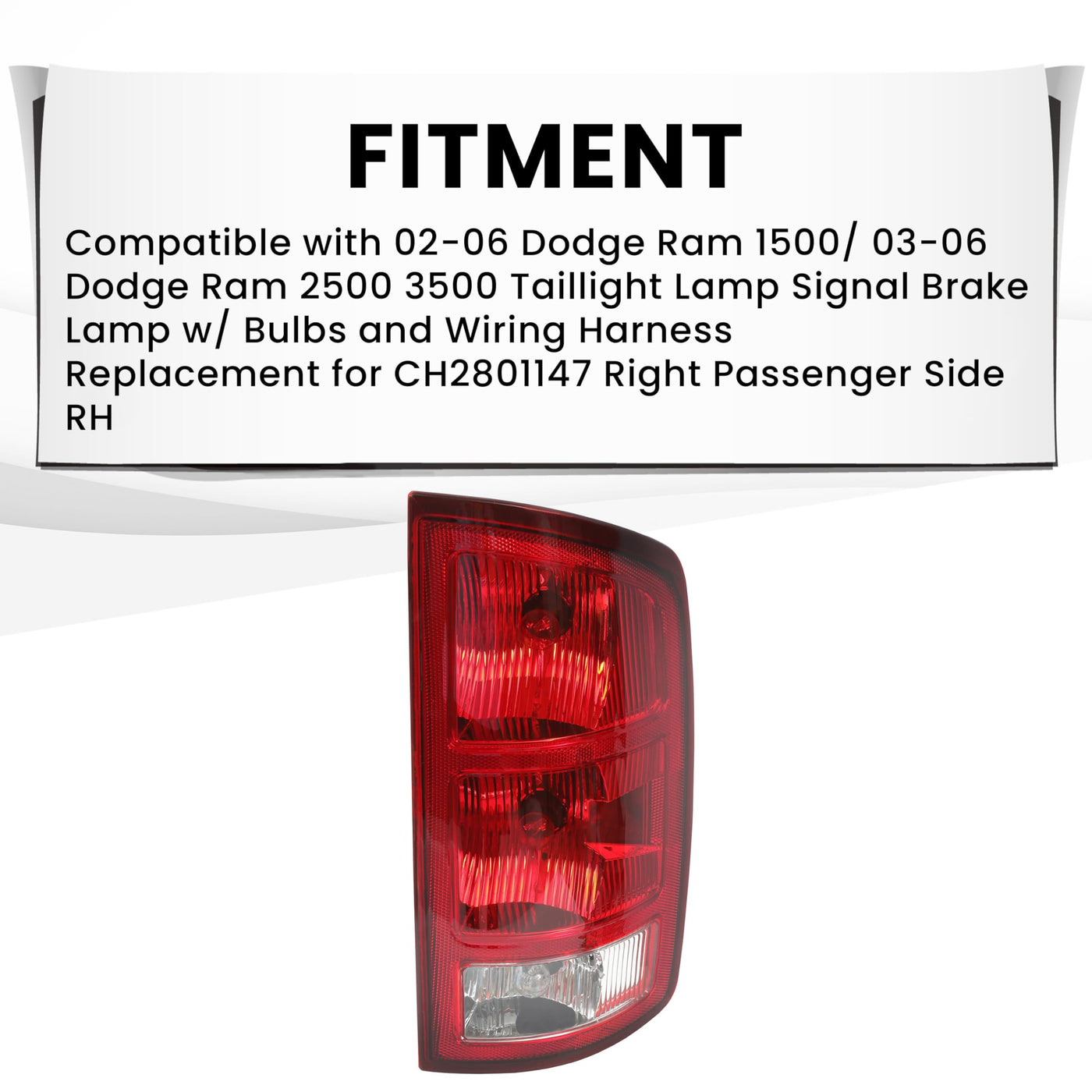 Hecasa Taillight Tail Light Lamp Signal Brake Lamp W/ Bulbs And Wiring Harness Compatible With 02-06 Dodge Ram 1500/ 03-06 Dodge Ram 2500 3500 Replacement For Ch2801147 Right Passenger Side Rh Fitment- Taillight Tail Light Lamp Signal Brake Lamp W/ Bulbs And Wiring Harness Compatible With 2002-2006 Dodge Ram 1500/ 2003-2006 Dodge Ram2500 3500. Reference Numbers - Replaces Partslink #: Ch2800155, Ch2800147, Ch2819107, Replaces Oe #: 55077348Af, 55077348Ac, 55077348Ad. Condition- Material: Plastic| Color: Red/ Clear Lens + Chrome Housing. Features- Leverage Advanced Design To Deliver Performance With Superior Visibility. Easy To Install- Plug-N-Play, Ready To Install & Use Right Out Of The Box, No Wiring Or Any Modification Needed. Package Listing- 1* Right Passenger Side Rh Tail Light W/ Bulbs And Wiring Harness. Instruction Is Not Included.