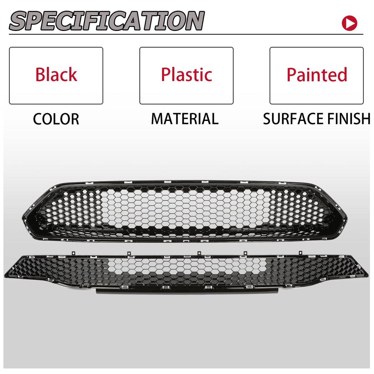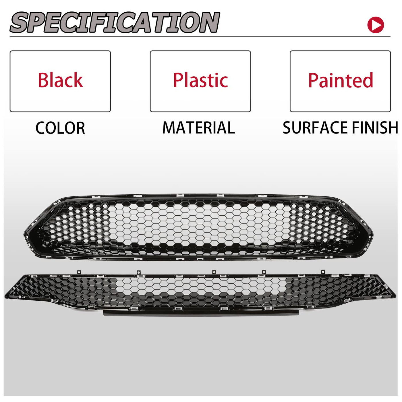 HECASA Upper + Lower Grille Compatible with 2018-2023 Ford Mustang Black Honeycomb Style Bumper Grill Fitment: Upper + Lower Grille Compatible with 2018-2023 Ford Mustang All Models. Condition: New in box. Color: Black. Surface Finish: Painted. Made of high quality plastic with strong strength and impact resistence. Feature: The honeycomb mesh style design will make the front of the car look domineering and stylish. Upgrade the appearance of the car. Installing the upper + lower grille will give you a bright feeling. Package Included: 1 Front Upper Grill + 1 Lower Bumper Grill as picture shows. **NOTE: Instruction and hardware are not included. Easy Installation: Bolt-on Installation. No need to modify. Professional Installation is Highly Recommended.