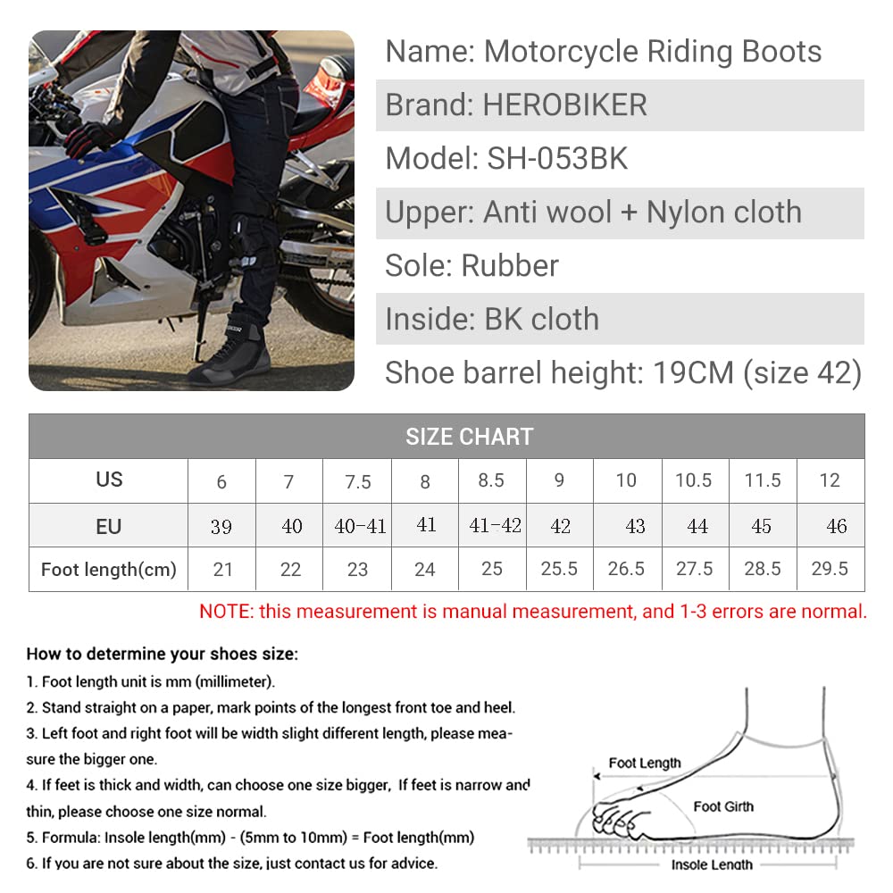 Q: How do I choose the right size for these motorcycle boots?A: To find the right fit, refer to the size chart provided in the product details. If you need assistance, feel free to contact us for help with sizing.