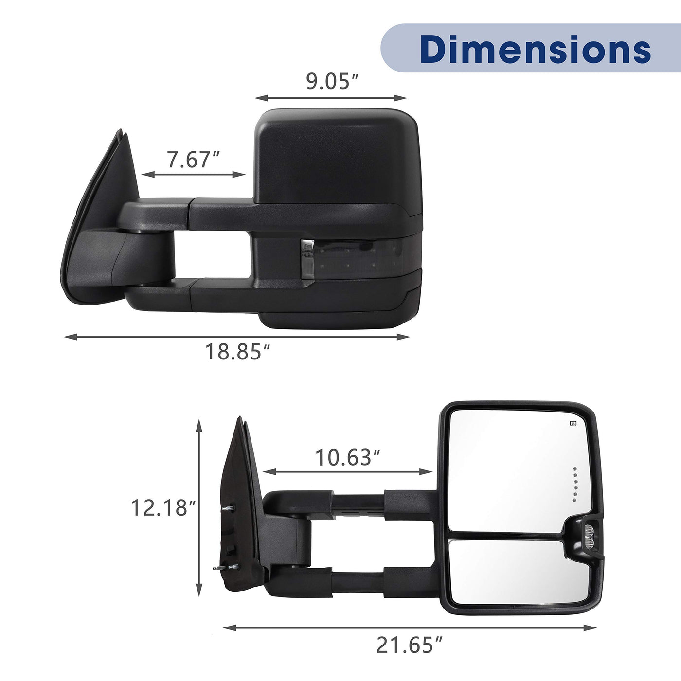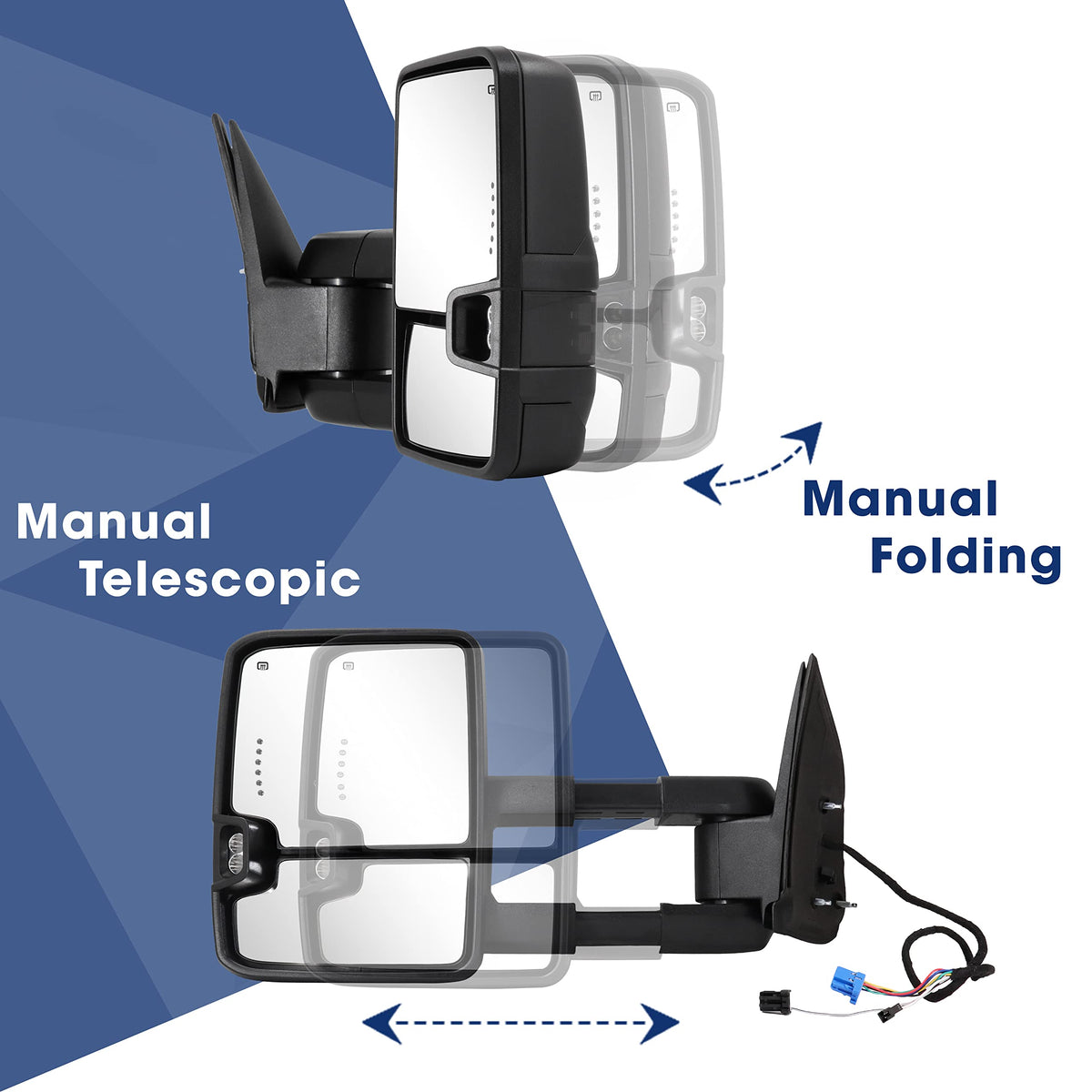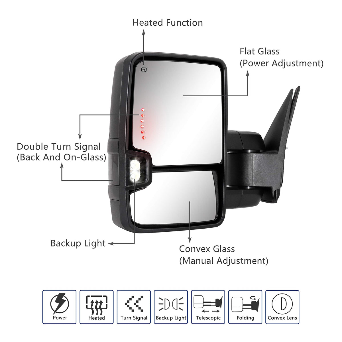 Q: What features do these towing mirrors offer?A: These towing mirrors come equipped with adjustable power glass, heated defrost, LED turn signal lights both on-mirror and on-back, a backup lamp, and dual glass (flat glass and convex glass). They also feature manual telescoping and folding for convenience.