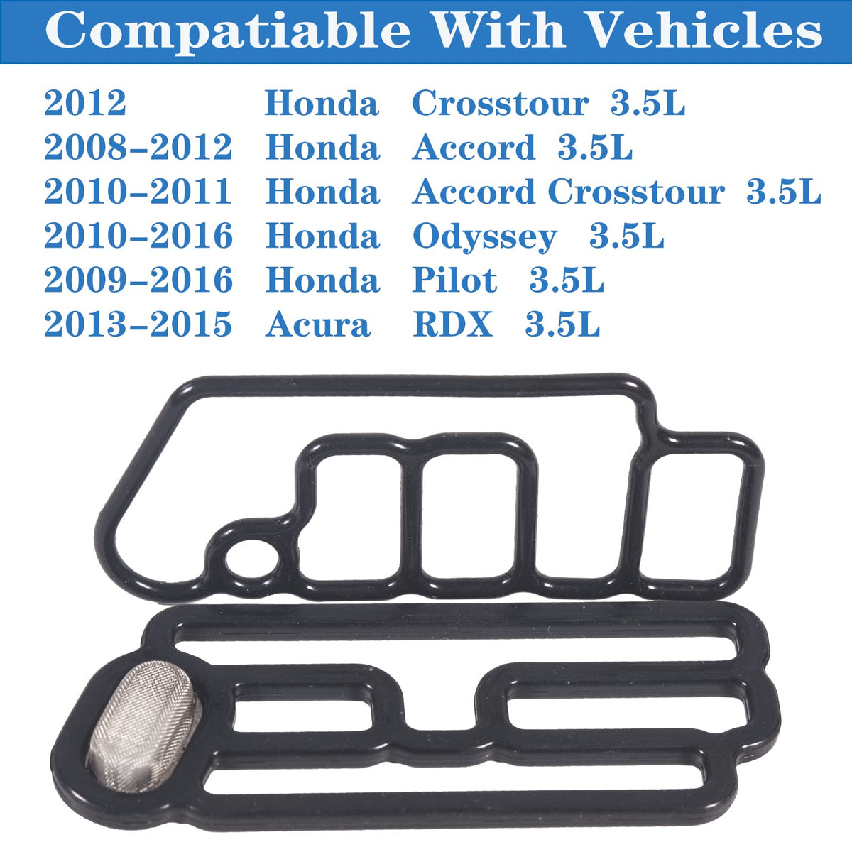 Q: What vehicles are compatible with the HIHIAV VVT VTEC Solenoid Spool Valve Gasket?A: The HIHIAV VVT VTEC Solenoid Spool Valve Gasket is compatible with several Acura and Honda models, including the Acura RDX (2013-2015), Honda Accord (2008-2012), Honda Accord Crosstour (2010-2011), Honda Crosstour (2012), Honda Odyssey (2008-2016), and Honda Pilot (2009-2015).