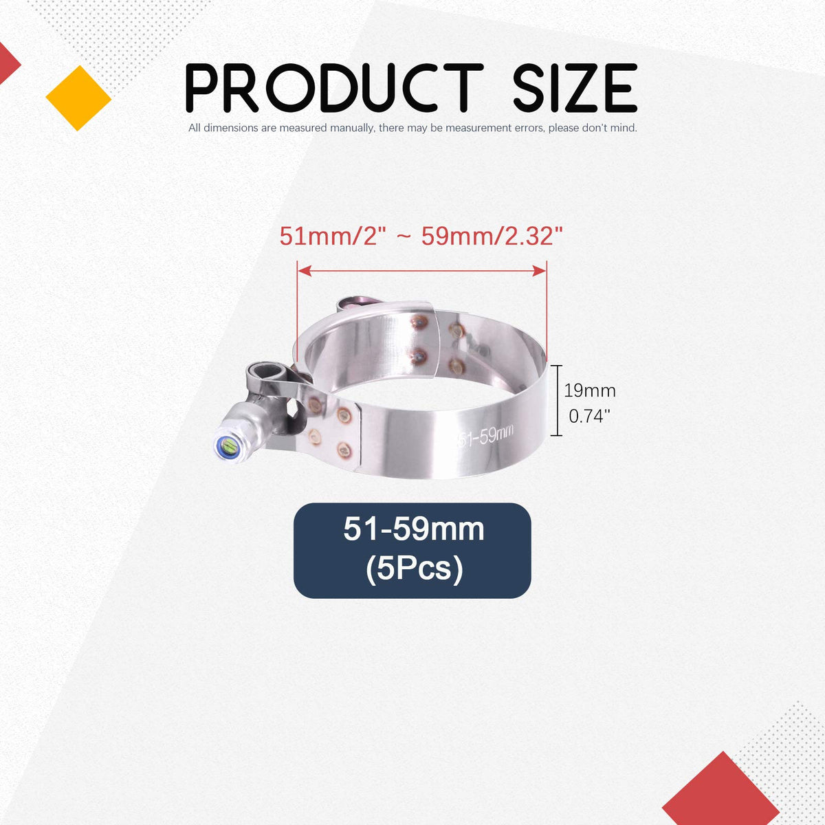 B>Hilitchi 5Pcs Stainless Steel T-Bolt Clamps With Rounded Band Edges Heavy Duty Turbo Intake Intercooler Clamp (51-59Mm) For 1 34 Inch Features: Focusing On Quality And With Fine Buffing Smooth Surface Without Burr Good Tightening Effect, Durable, No Rust, Corrosion Resistance Smooth And No Uneven Marks Complete Model Removable Installation And Reusable Specification Product Type:At-Bolt Hose Clamp Material:Astainless Steel Size:A51-59Mm Number Of Items:A5Pcsb>
