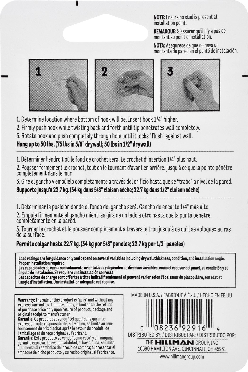 Q: How many pieces come in a package of the Hillman Gorilla Hooks?A: Each package of Hillman 121048 Gorilla Hooks contains two pieces, providing you with multiple options for hanging your artwork.