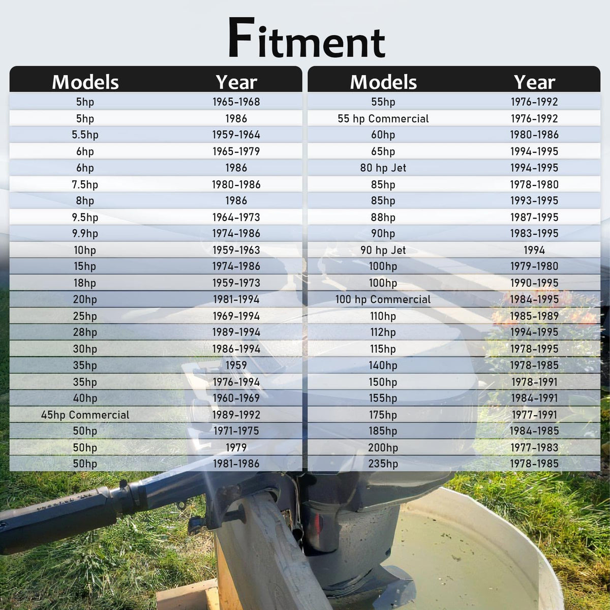 Fitment For The Following Johnson & Evinrude Applications: 5Hp 1965-1968;5Hp 1986;5.5Hp 1959-1964;6Hp 1965-1979;6Hp 1986;7.5Hp 1980-1986;8Hp 1986;9.5Hp 1964-1973;9.9Hp 1974-1986;10Hp 1959-1963;15Hp 1974-1986;18Hp 1959-1973;20Hp 1981-1994;25Hp 1969-1994;28Hp 1989-1994; 30Hp 1986-1994;35Hp 1959;35Hp 1976-1994;40Hp 1960-1969;45Hp Commercial 1989-1992;50Hp 1971-1975;50Hp 1979;50Hp 1981-1986;55Hp 1976-1992;55 Hp Commercial 1976-1992;60Hp 1980-1986;65 Hp Jet 1994-1995;80 Hp Jet 1994-1995;85 Hp 1978-1980;85 Hp 1993-1995;88 Hp 1987-1995; 90 Hp 1983-1995;90 Hp Jet 1994;100 Hp 1979-1980;100 Hp 1990-1995;100 Hp Commercial 1984-1995;110 Hp 1985-1989;112 Hp 1994-1995;115 Hp 1978-1995;140 Hp 1978-1985;150Hp 1978-1991;155Hp 1984-1991;175Hp 1977-1991;185Hp 1984-1985;200Hp 1977-1983;235Hp 1978-1985.