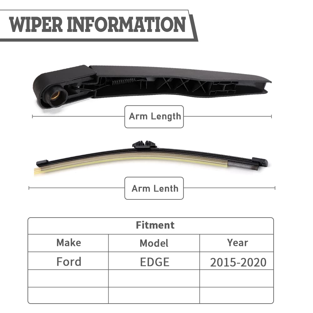 Easy Install and Removal: Including Remove Tools, Nut and Wrench. Please See the Vedio Follow the Installation Instructions Fitment: Fit for FORD EDGE 2015-2024 Specification: Rear Wiper Arm Length:310MM Rear Wiper Blade Length:310MM Repaces OE Part Number:FT4Z17528A Packing Includes: 1 Rear Wiper Arm 1 Rear Wiper blade 1 Rear Wiper Cover 1 Rear Wiper Nut 1 Install Wrench Product Features: Install: Includes Nut and Tools Clear: Used Nature Rubber Durability:70%PBT +30% Fuberglass Weather Resistant: 304H Steel Note: * Please Remove the Green Protector Before Use * Please Make Sure Your Car Meet the Following Models Before Place Order * Please Follow the Instructions Vedio to Install * Kindly find the IMAGE DESCRIPTION Make sure all plastic/metal is removed from the wiper motor shaft or the new arm will not fit!!