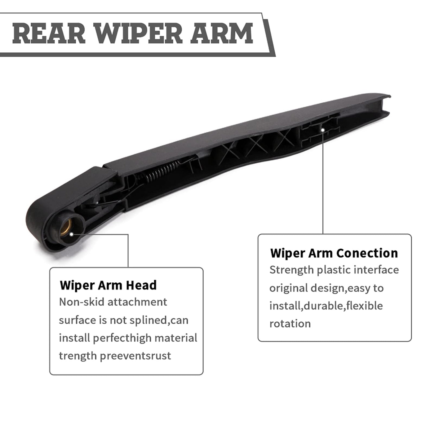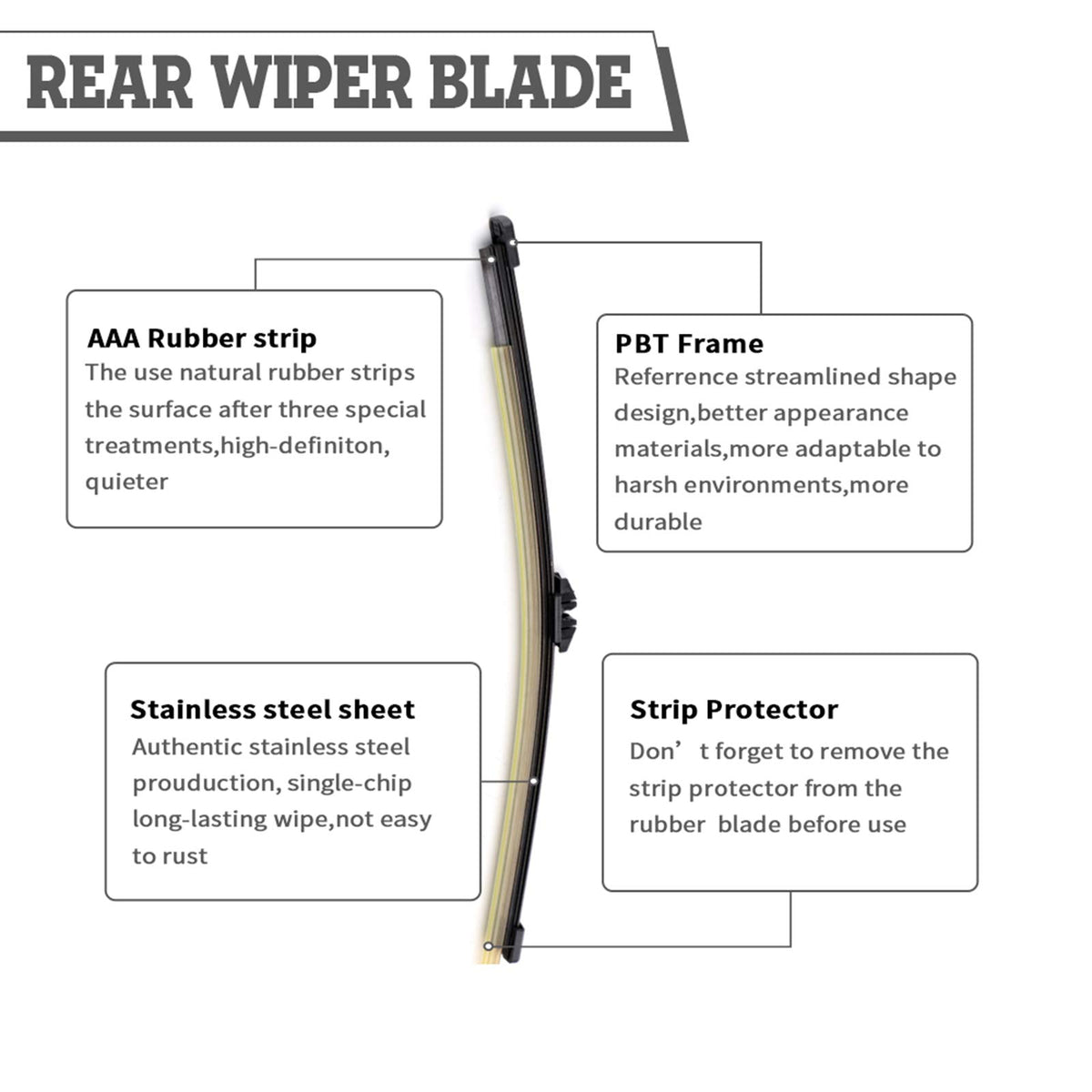 Q: What materials are used in the construction of this rear wiper set?A: The rear wiper arm and blade are made from durable 304H steel and natural rubber, providing excellent weather resistance and longevity.