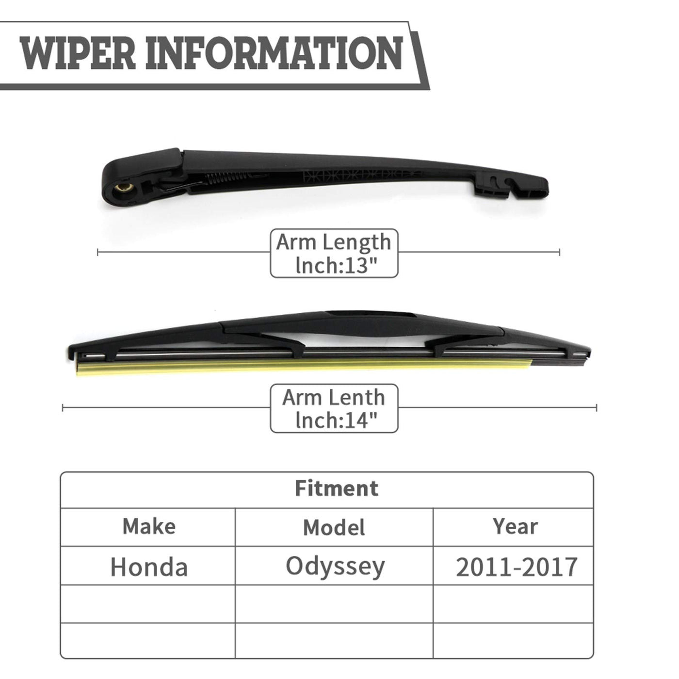 Easy Install and Removal: Including Remove Tools, Nut and Wrench. Please See the Vedio Follow the Installation Instructions Fitment: Fit for Honda Odyssey 2011-2017 Specification: Rear Wiper Arm Length:335MM Rear Wiper Blade Length:360MM Repaces OEM Part Number: 68256590AA, 68256-590AA Packing Includes: 1 Rear Wiper Arm 1 Rear Wiper blade 1 Rear Wiper Cover 1 Rear Wiper Nut 1 Install Wrench Product Features: Install: Includes Nut and Tools Clear: Used Nature Rubber Durability:70%PBT +30% Fuberglass Weather Resistant: 304H Steel Note: * Please Remove the Green Protector Before Use * Please Make Sure Your Car Meet the Following Models Before Place Order * Please Follow the Instructions Vedio to Install * Kindly find the IMAGE DESCRIPTION Make sure all plastic/metal is removed from the wiper motor shaft or the new arm will not fit!!