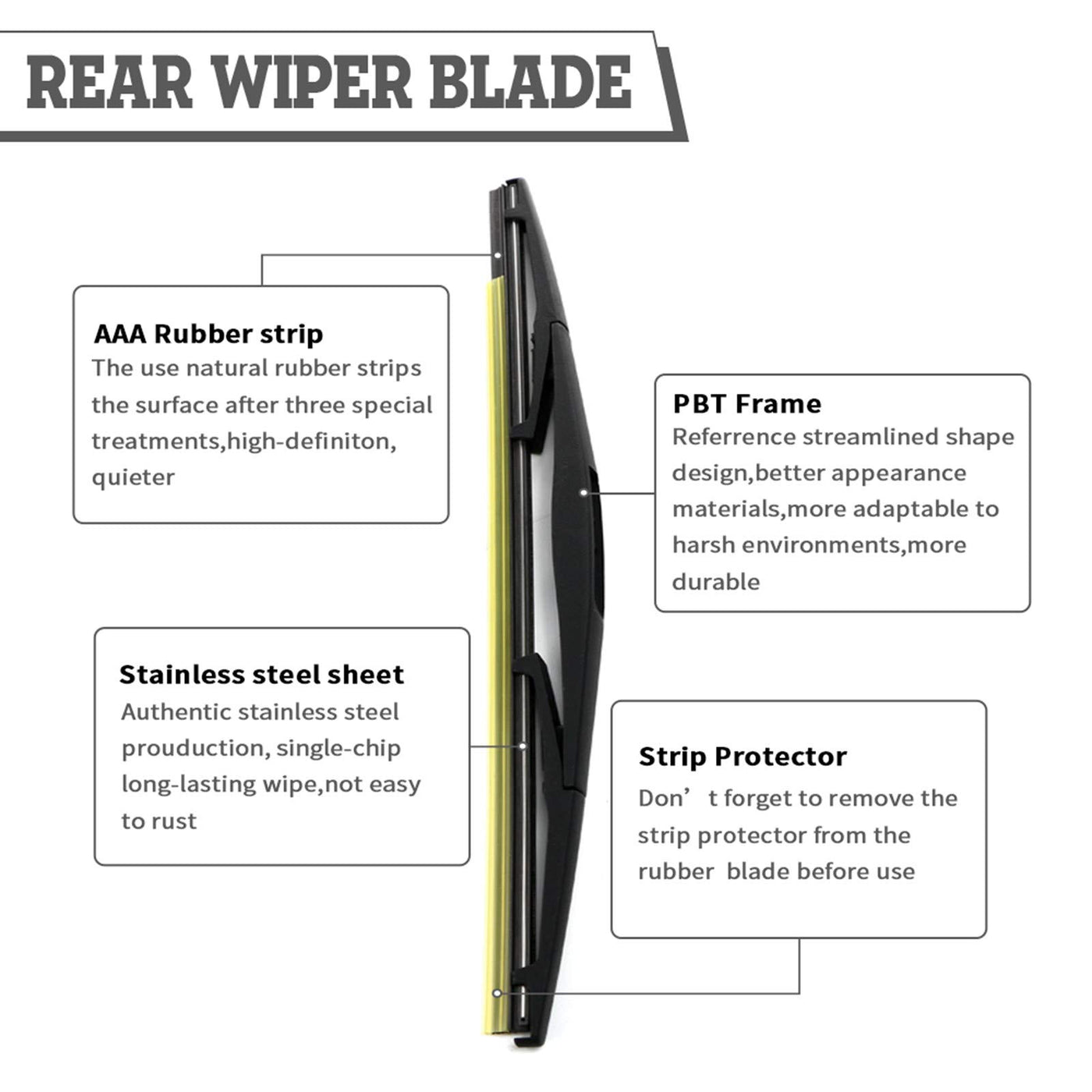 Q: What materials are used in the HODEE rear wiper components?A: The rear wiper arm and blade are made from durable materials, including 304H steel for weather resistance and natural rubber for the blade, ensuring long-lasting performance.