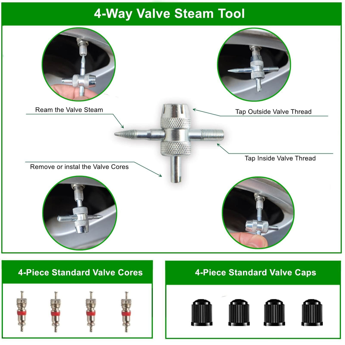 Q: What tools are included in the HolaKit Tire Plug Kit?A: The kit includes essential tools such as a T-Handle Rasp Tool, T-Handle Insert Tool, 10 self-vulcanization tire plugs, a knife, and a bonus valve tool set with 4-way valve steam tools, standard valve cores, and caps.