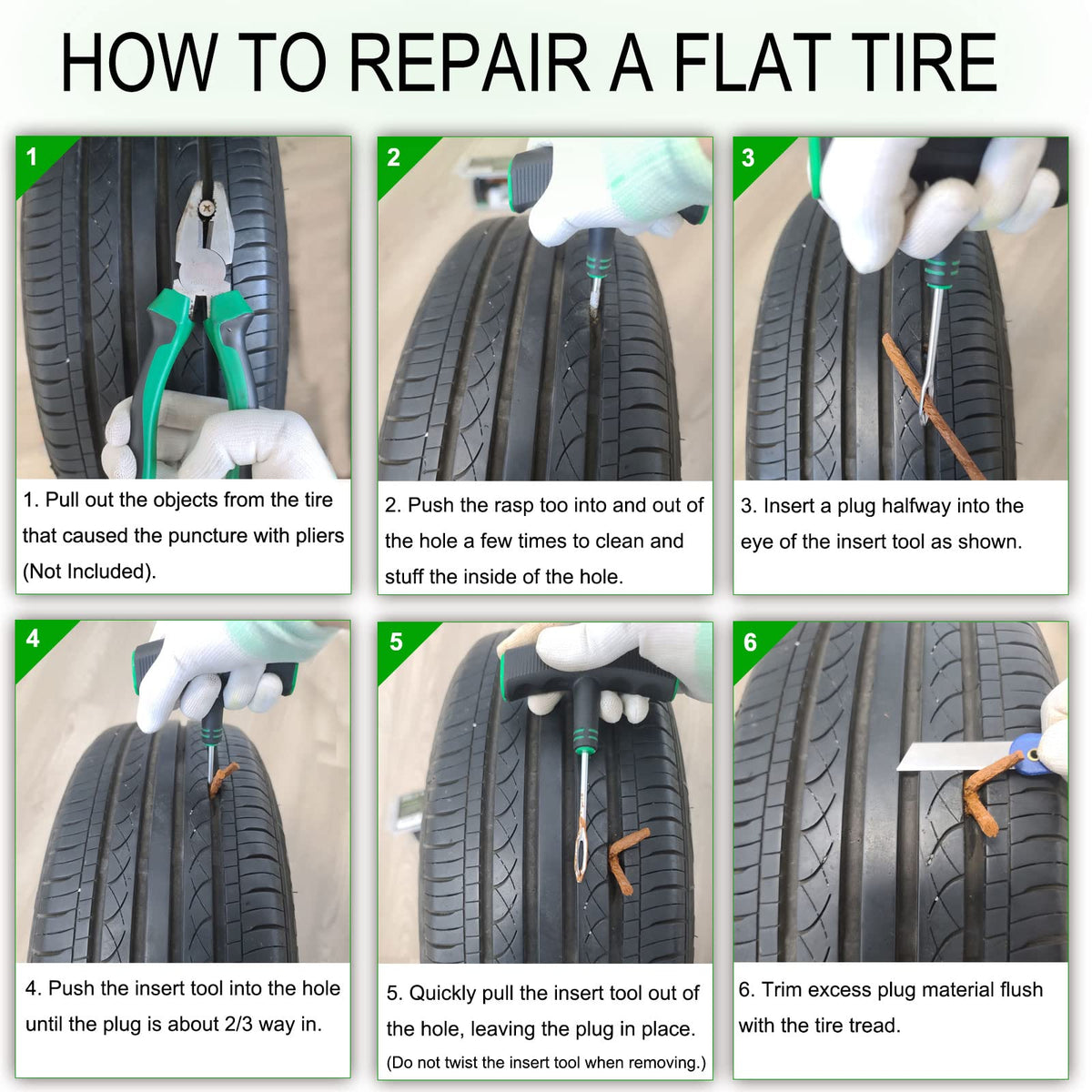Q: How does the upgraded T-handle improve the usability of the kit?A: The upgraded T-handle is 100mm long, larger than standard handles, and is made from a combination of hard plastic and soft thermoplastic rubber. This design provides better grip and comfort, allowing for easier and more effective tire repairs.