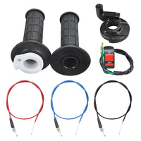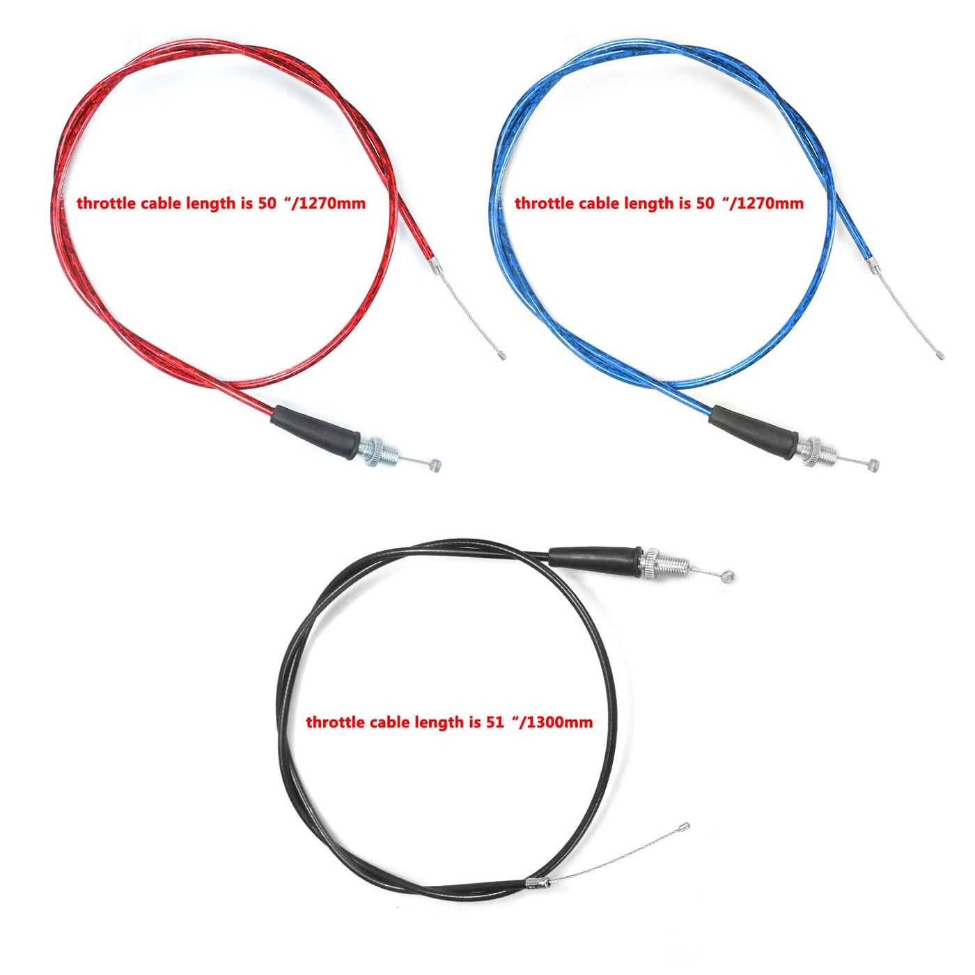 Q: What is included in the package of the throttle cable kit?A: The package includes one black throttle cable, one blue throttle cable, one red throttle cable, one left hand grip, one right hand grip, one throttle aluminum clamp, and one on/off kill switch, providing everything needed for installation.