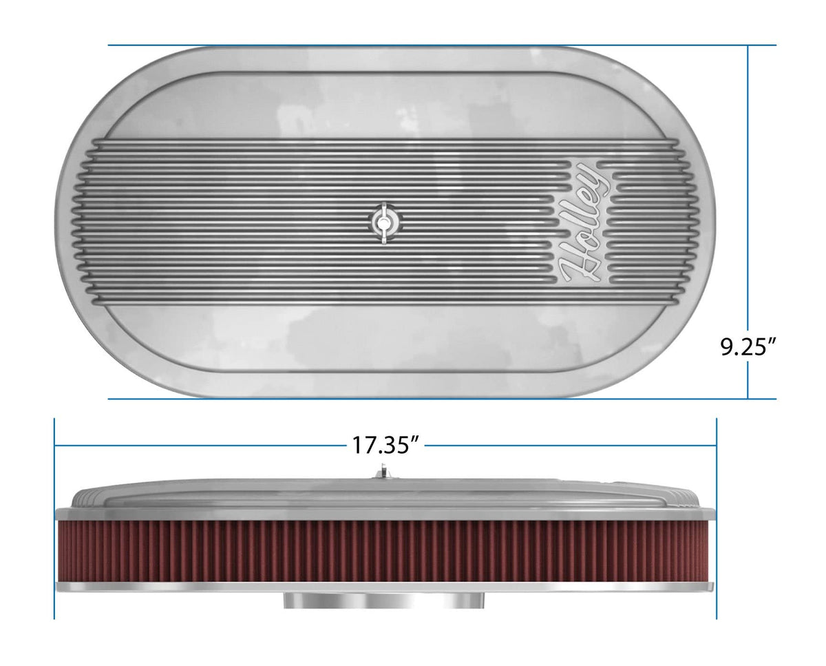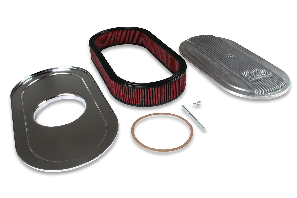 The Oversized Air Cleaner Look Was King In The Muscle Car Era, And We Wanted To Take Engine Bay Styling Back To That Nostalgic Time With These Holley Vintage Series Oval Air Cleaner Assemblies. Each Air Cleaner Assembly Includes A Durable Cast Aluminum Vintage Series Finned Lid, A Stamped Steel 1/2' Raised Baseplate, A 2.5' Tall Premium Washable And Reusable Filter Element, And All Hardware Needed For Easy Installation. These Oversized Oval Air Cleaner Assemblies Dwarf The Competition With Their Size - Measuring At 17' Long X 9' Wide - Which Will Make Your Engine Bay Stand Out In A Crowd Of Stale Old Oval Air Cleaners. The Included Stamped Steel Baseplate Is Designed To Fit Single 4-Barrel Carburetors With A Standard 5-1/8' Diameter Neck, And The 1/2' Raise Is Enough To Clear Throttle Linkages, Carburetor Bowls, And Distributors Without Any Worry Of Interference. These Oval Air Cleaners Are Available In 5 Unique Finish Options To Perfectly Match Most Holley Vintage Series Valve Covers, And Paired Together, Their Styling Creates An Unsurpassed Vintage Vibe.