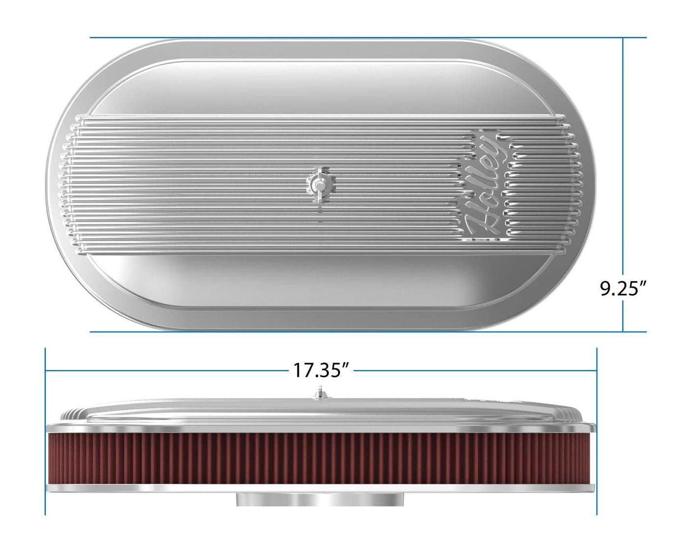 Q: What are the dimensions of the Holley Vintage Series Oval Air Cleaner?A: This air cleaner measures 17 inches in length and 9 inches in width, making it significantly larger than standard oval air cleaners, which enhances its vintage aesthetic and functionality.