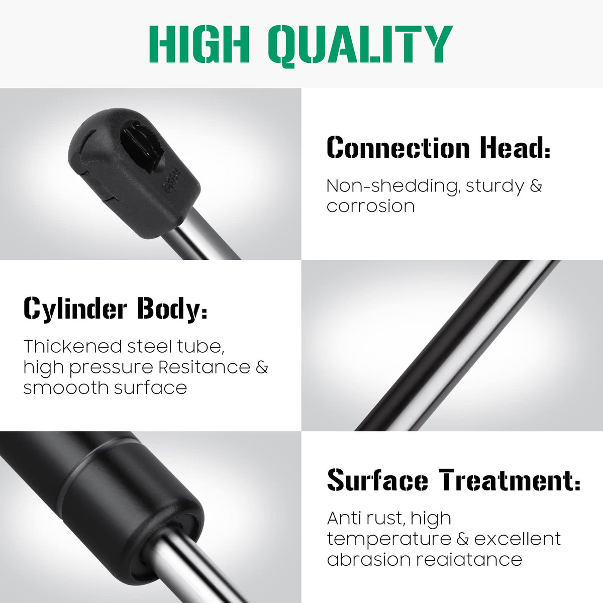Q: What materials are used in these hood lift supports?A: These hood lift supports are made of high-quality steel, ensuring durability and reliable performance over time.