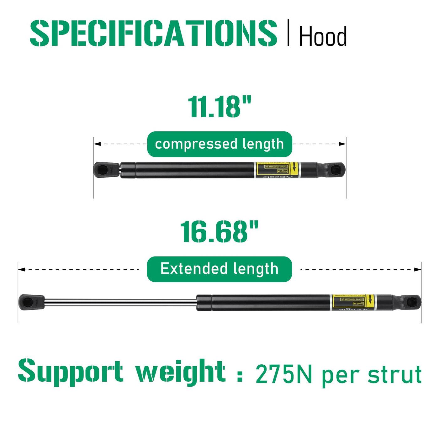 Q: What are the specifications of these lift supports?A: The extended length of each hood lift support is 16.68 inches, and the compressed length is 11.18 inches. Each strut can support a weight of up to 275N.
