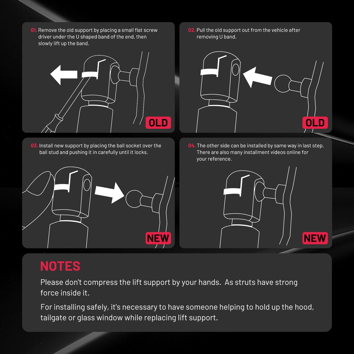 Q: How easy is it to install the BDFHYK gas struts?A: Installing the BDFHYK gas struts is very straightforward and can be done independently using just a flat screwdriver. However, it's important to safely hold the hood while installing, and online instructions are available for guidance.
