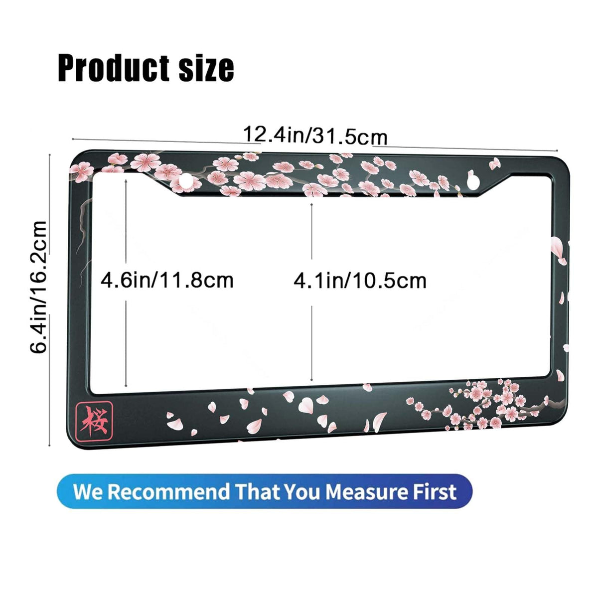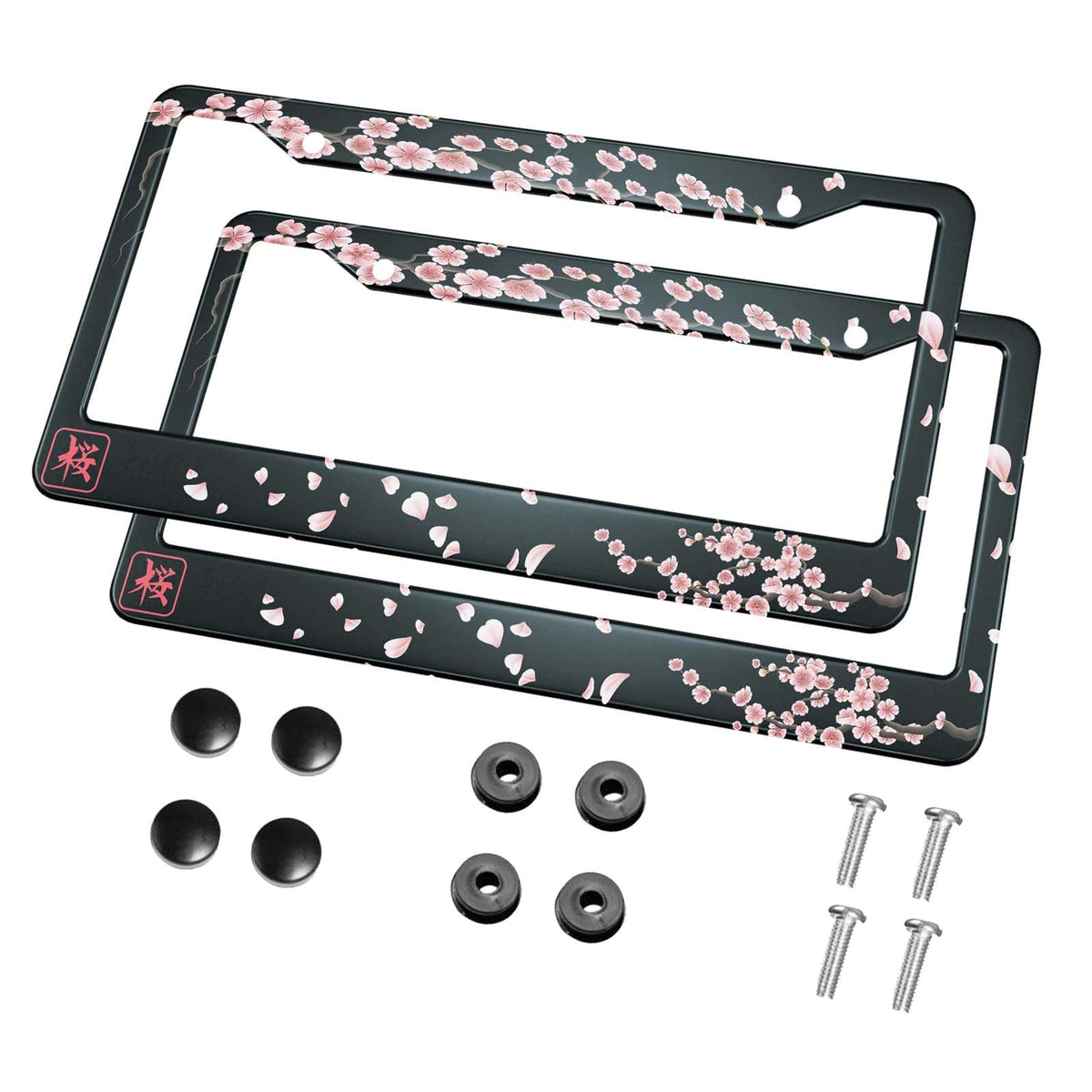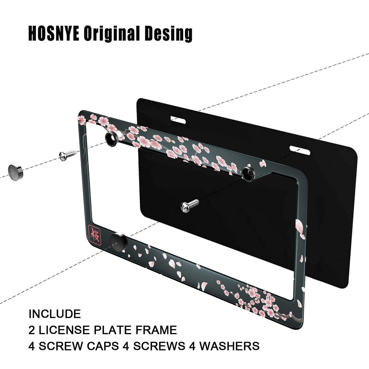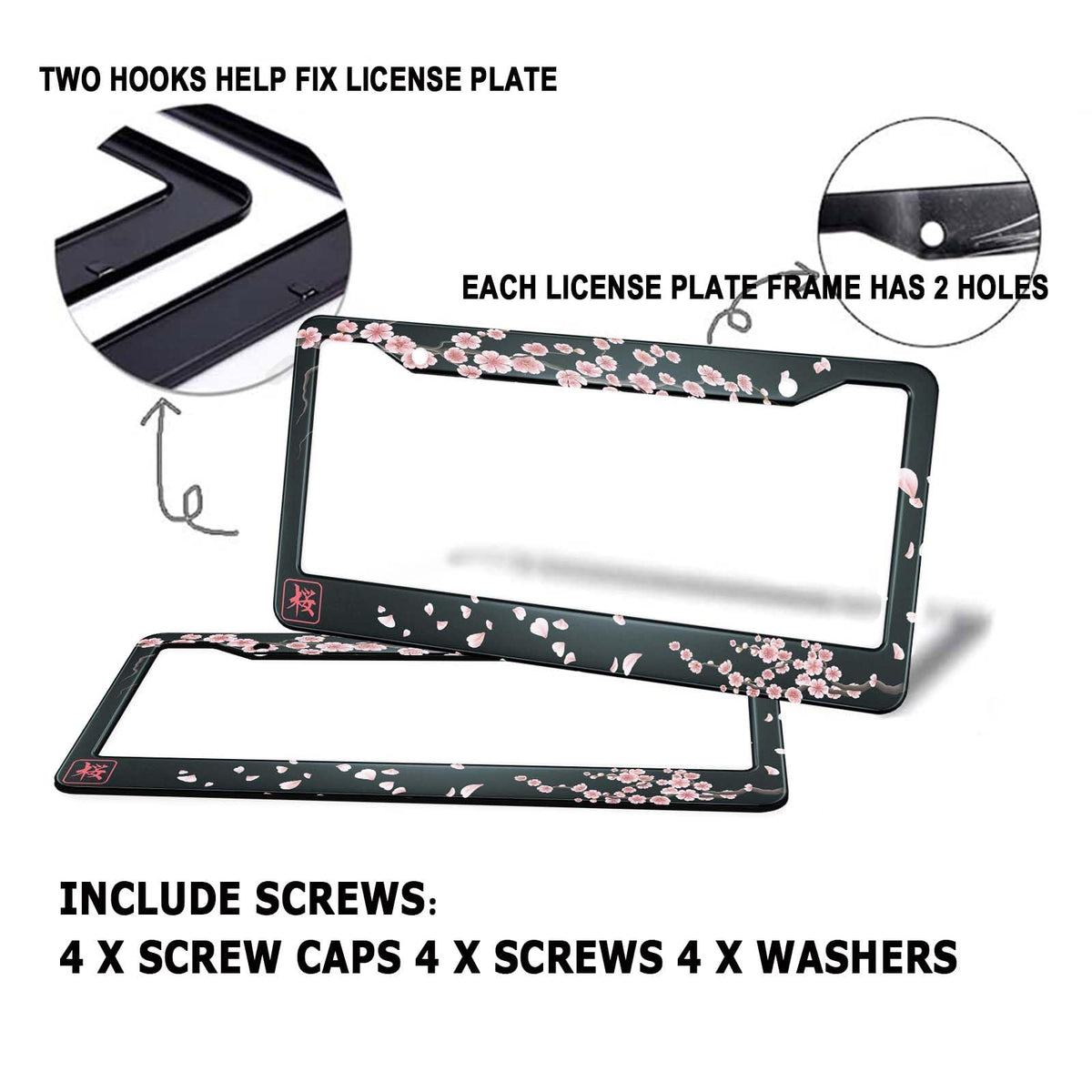 HOSNYE Japan Cherry Branch License Plate Frame Black 2 Pcs Flowers Hieroglyph Sakura Metal Cute Licenses Plates Frames Licenses