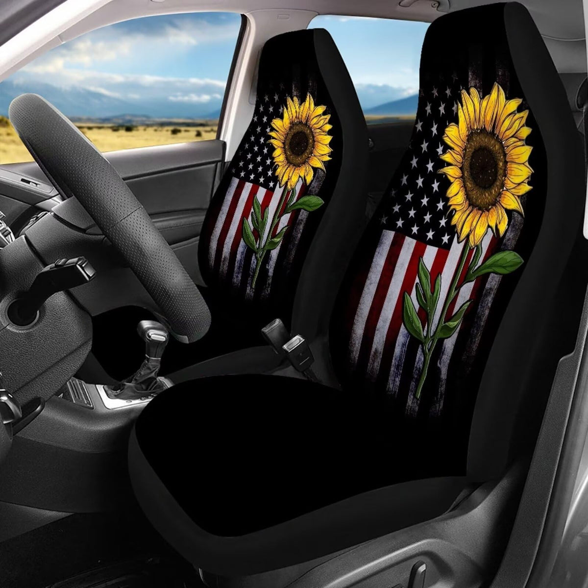 Howilath Sunflower American Flag July of 4th Patriotic Print 4 Pieces Car Seat Covers Full Set Interior Car Accessories Decor