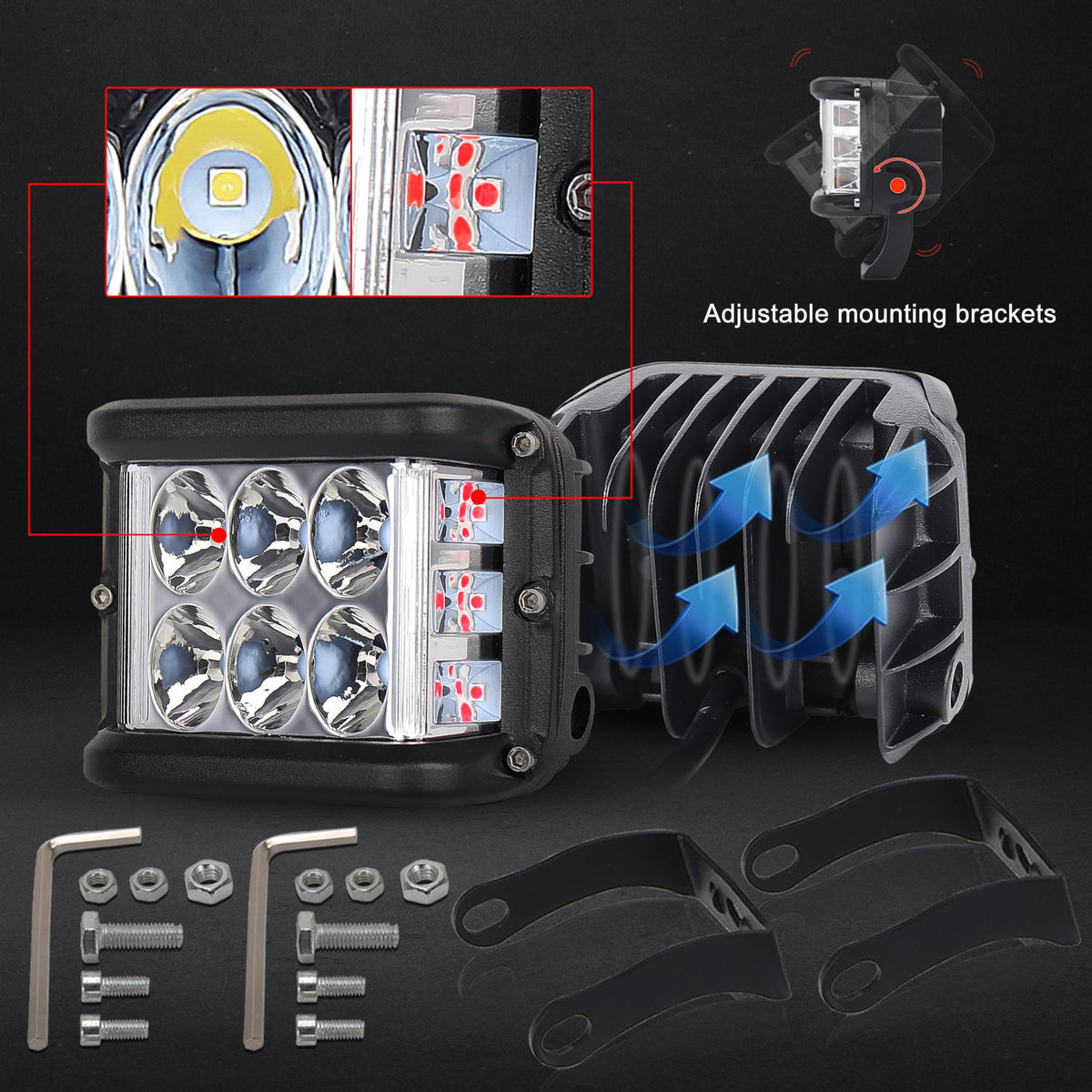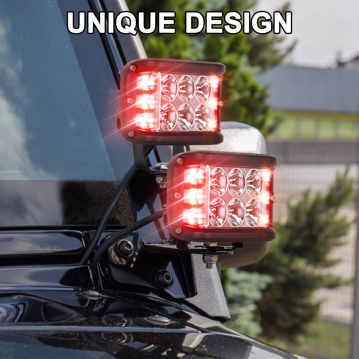 ?LIGHTING & UPGRADE FUNCTION?HOYUZA led pod lights come with Daytime Running Lights Function(6000K bright cool white spot light), Strobe/Solid side light function(3000K bright red side shooter flood beam), DRL & Red Solid/Strobe Function. The upgraded version of the switching function is more convenient. 60W/pair and 4000LM/pair illumination intensity. Super bright lights output, can make you see the road ahead and on both sides clearly while you are driving | ?UNIQUE DESIGN? Dual design of 3 LED triple sides for side shooter dual color led pods so as to broaden the driver's line of sight. Triple design on three sides(6 leds in the middle with high -brightness, 3 leds on each side). The strobe function on the side can be used as a warning light to bring higher safety to your driving. LED cubic spotlights can provide more than 180 degrees of Angle lighting coverage. Eliminate blind areas and raise lighting visibility to a new height | ?HIGH PERFORMANCE?The red led lights is made by 6063 durable aluminum alloy housing and sturdy PC lens. Performance well in heat dissipation. Waterproof IP67, Dust-proof and Shock proof, over 30,000 hours lifespan. Providing you with safe driving in harsh environments | ?WIDELY USE ON?The 4 inch led pod lights easy to install. Widespread Application, compatible with almost all 4 inches Trucks, Tractors, Jeep, Motorcycles, SUV, ATV, Toyota , 4x4, Offroad vehicles,Mining, UTV, Boat, Heavy Duty, and Farming , etc. The red side light design allows these pod lights to also be applied to law enforcement construction vehicles, cop trucks, bus, emergency construction vehicle, snow plow etc | ?PACKAGE?2 PCS led side shooter pods + 2 PCS Mounting Brackets+1 instruction. You can adjust the light to the right height with the adjustable mounting bracket. We provide 1 year product support. We're here to assist you if you have any questions