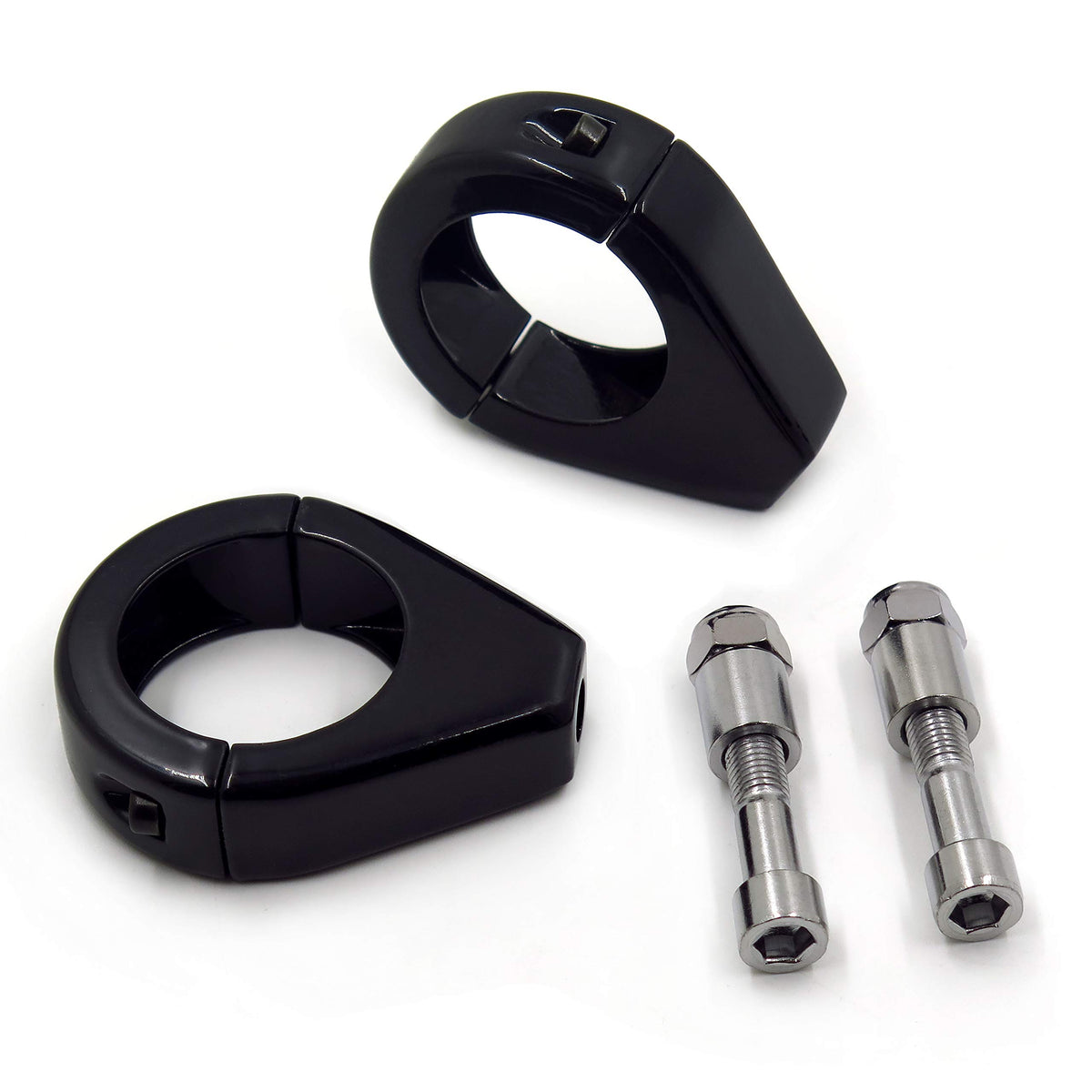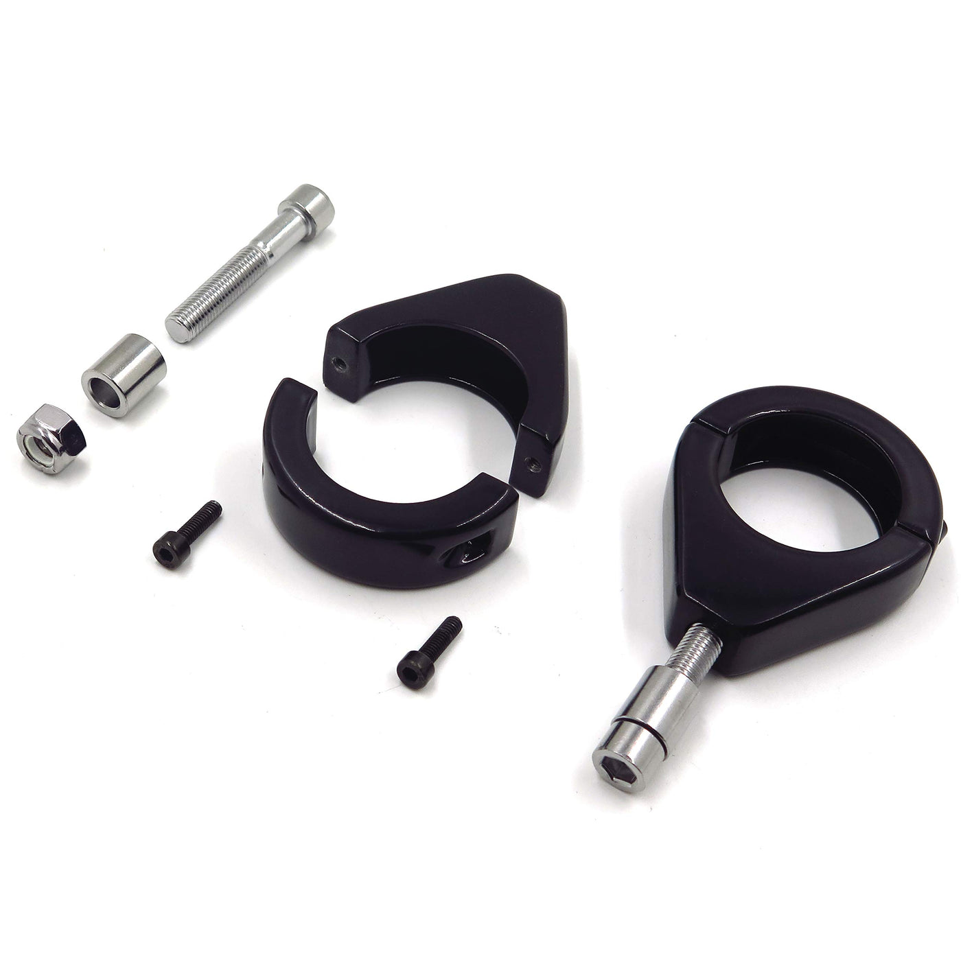Q: What does the package include when purchasing this fork clamp kit?A: The package includes 2 headlight brackets (left and right clamps) needed for relocating the front turn signals, but please note that instructions are not included.