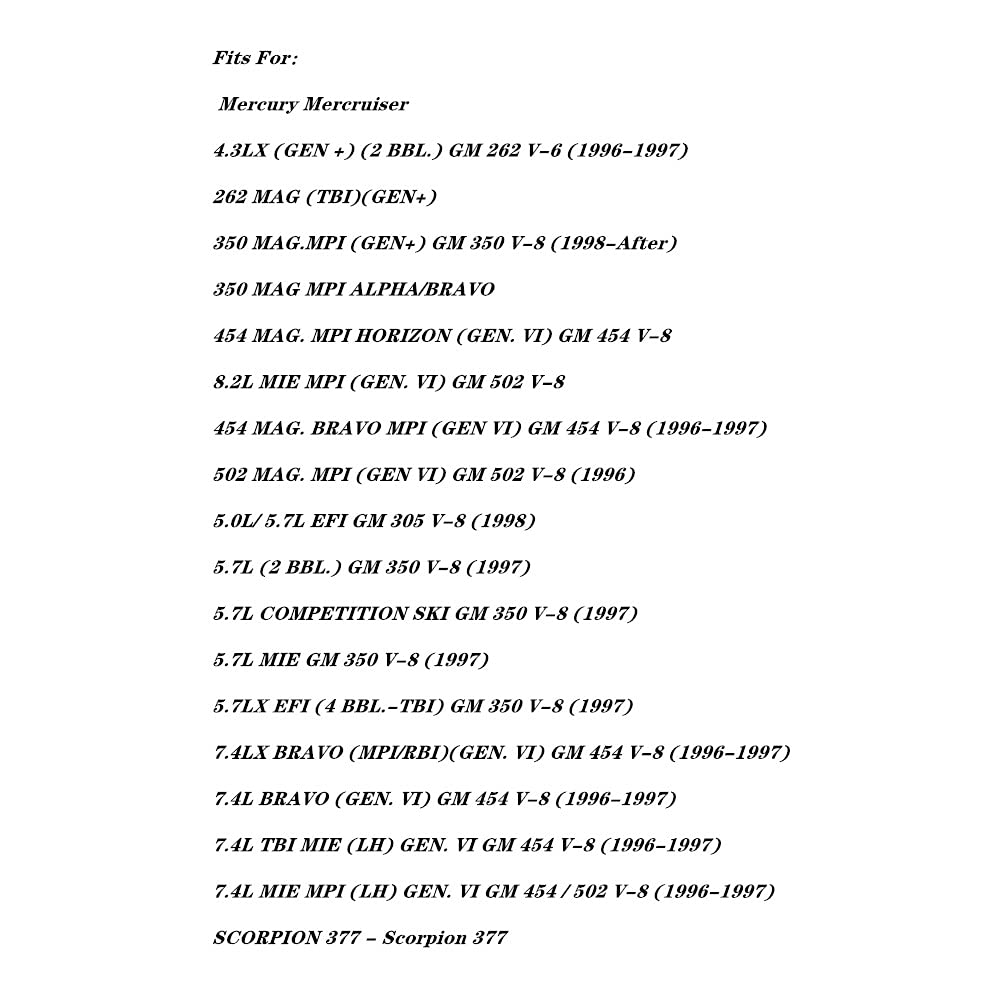 Q: What engines are compatible with the HuthBrother 18-0897 Exhaust Restricted Elbow Risers Gasket?A: The HuthBrother 18-0897 Exhaust Restricted Elbow Risers Gasket is compatible with a variety of Mercury Mercruiser V6 and V8 engines, including models from 1983 to 2002. Specifically, it fits engines like the 4.3LX, 350 MAG MPI, and 454 MAG, among others.