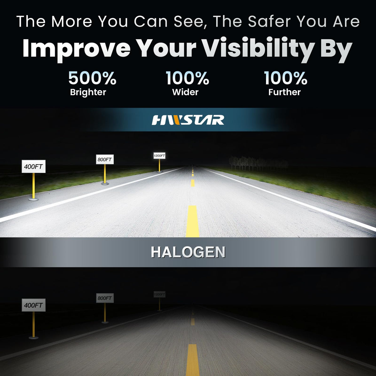 Q: What makes these headlights different from standard headlights?A: The HWSTAR 110W 5x7 LED Headlights feature a super bright output of 6000 lumens on high beam and 3800 lumens on low beam, ensuring excellent visibility. They also have a clear cutoff line that reduces glare for oncoming drivers, making them safer compared to standard headlights. Additionally, they are IP67 waterproof rated, providing durability in various weather conditions.
