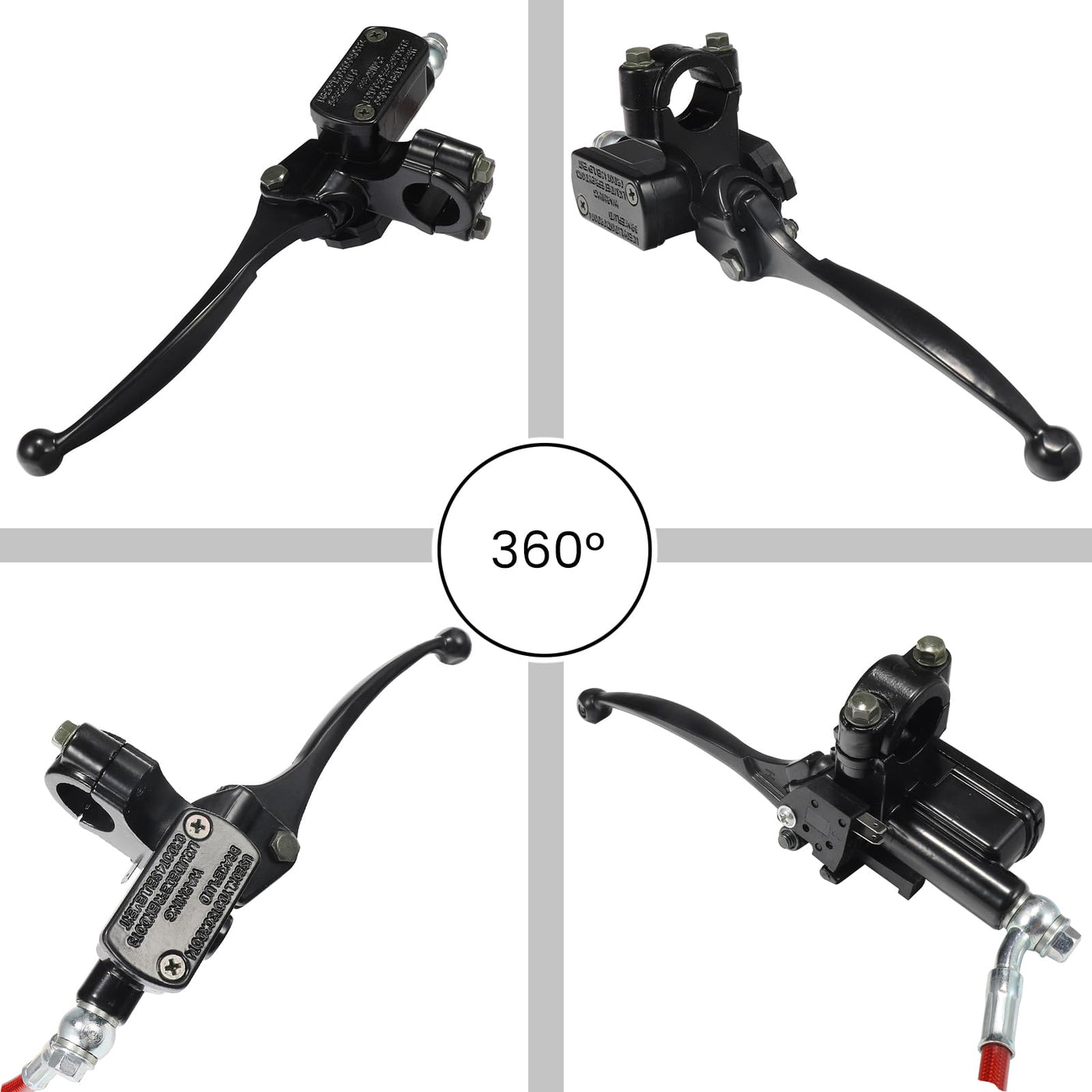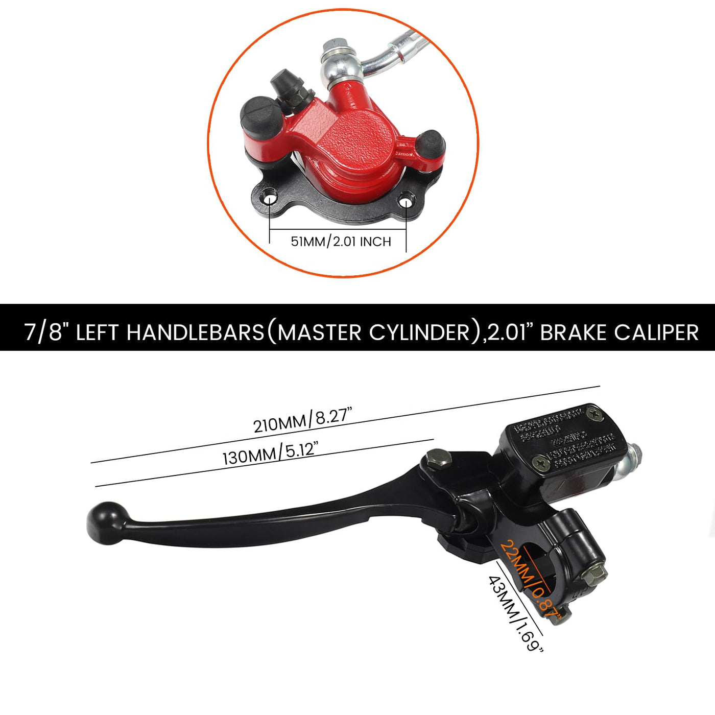 Q: What components are included in the hydraulic brake system kit?A: The kit includes a 7/8" left handlebars master cylinder, a 50 inch brake hose, a brake caliper, hose tube, brake pads, and an oil switch, providing everything needed for a complete installation.