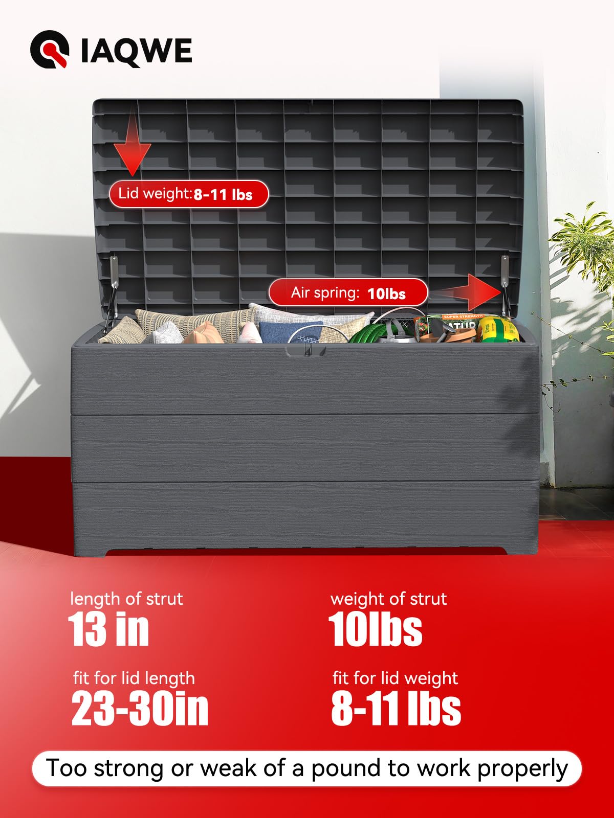 15inch 45N Lift Supports Struts used in different application scenes such as household cabinets, advertising boards, bedframes, truck canopy, homebuilt generator house, trash bin lid, loft floor hatch, outdoor bench lid, trap door, garbage shed lid, camper shell window, teardrop trailer, and so on. Specification:Force: 10 Lbs/45 N(Per Strut),Extended Length (Center-to-Center): 15 inchCompressed Length (Center-to-Center): 9 inchBracket Holes ' Size: 8 mm(diameter), 8 mm(diameter), 10 mm X 8 mm(Length X Width)Package:2 Pcs* IAQWE 44N 15 INCH Lift SupportHOW TO INSTALL&ADJUST IT:If you want to open the lid at 90-120 degrees, the mounting point is at 120-130 mm(4.72-5.12 inch) to the hinge 's direction.If you want to open the lid at more than 120 degrees, the mounting point on the door is at the 75 mm(2.95 inch) to the hinges direction.If you feel the it 's too powerful, you can move the mounting point 20 mm(0.79 inch) towards the hinges 's direction ,while if you feel it 's too weak,you can move it 20 mm(0.79 inch)towards the opposite direction.