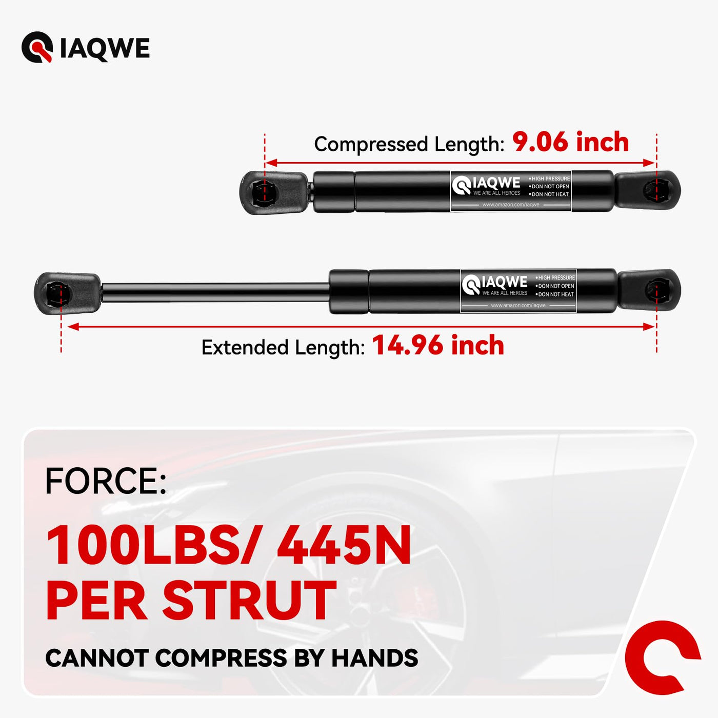 [ Gas Struts Parameter ]: Force: 100Lbs/445N 15 Inch per Strut. Extended Length: 14.96 Inch, Compressed Length: 9.06 Inch. A pair of 2 shocks, Very Strong! Can not compress directly by your hands | [ Replacement Part Number ]: 1:1 OEM Interchange number: SE150P100, SE150P100EZ10, SE150P100S10, SE150P100M10 | [ 100LB Struts Application ]: Suitable for Leer ARE Snugtop camper shell rear topper window, truck cap topper, tool box, toy chest box, outdoor TV cabinet window lid and so on. Scope of application: 80-110Lb | [ Stable. Strong. Reliable. ]: Our struts are suitable for various harsh weather environments such as outdoor heavy rain and minus 104?. As the best and reliable gas spring manufacturer, IAQWE will always stand behind you to provide you with the strongest support | [ 3-Minute Upgrade ] Package includes: 2 gas struts + 1 instruction. Just use a screwdriver to remove old struts and install IAQWE's - the whole swap takes just 3 minutes! | [ Reliable Customer Service ] IAQWE offers 24-hours online customer service, just click ''ask a question'' if you have any questions before or after purchase. IAQ always offer you satisfying help in time