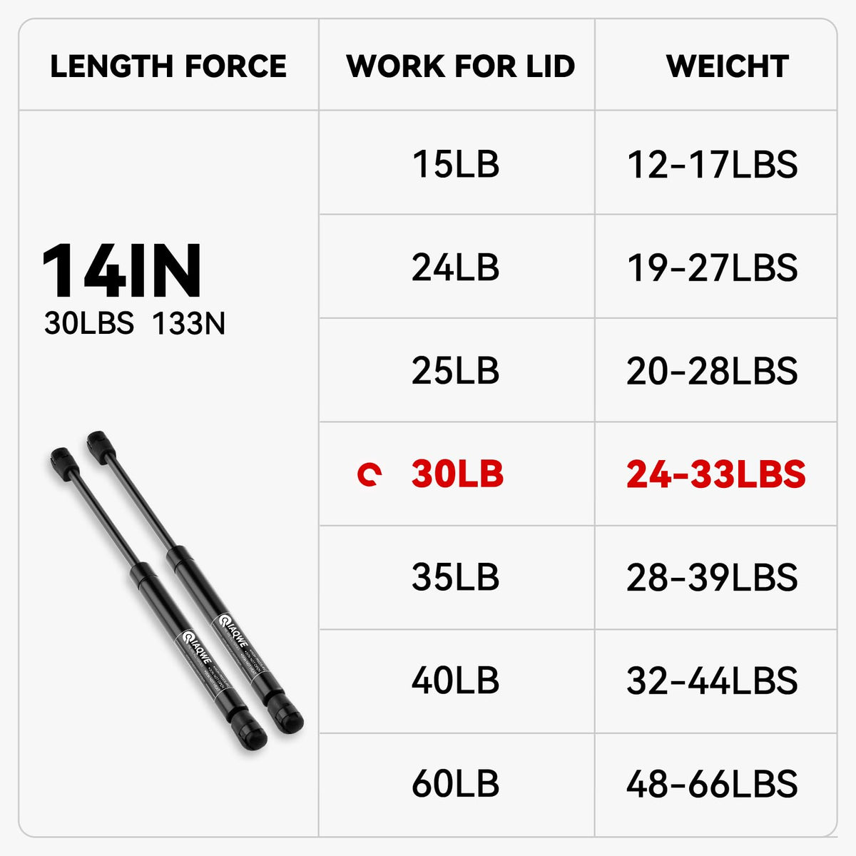 [ Gas Struts Parameter ]: Force: 30Lbs/133N 14 Inch per Strut. Extended Length: 14.00 Inch, Compressed Length: 8.60 Inch. A pair of 2 shocks, Very Strong! Can not compress directly by your hands | [ Replacement Part Number ]: 1:1 OEM Interchange number: 8411QW,C1623609,MDI03EA,NP1400308P,SE140P30 | [ 30LB Struts Application ]: Suitable for Leer ARE Snugtop camper shell rear topper window, truck cap topper, tool box, toy chest box, outdoor TV cabinet window lid and so on. Scope of application: 24-33Lb | [ Stable. Strong. Reliable. ]: Our struts are suitable for various harsh weather environments such as outdoor heavy rain and minus 104?. As the best and reliable gas spring manufacturer, IAQWE will always stand behind you to provide you with the strongest support | [ 3-Minute Upgrade ] Package includes: 2 gas struts + 1 instruction. Just use a screwdriver to remove old struts and install IAQWE's - the whole swap takes just 3 minutes! | [ Reliable Customer Service ] IAQWE offers 24-hours online customer service, just click ''ask a question'' if you have any questions before or after purchase. IAQ always offer you satisfying help in time