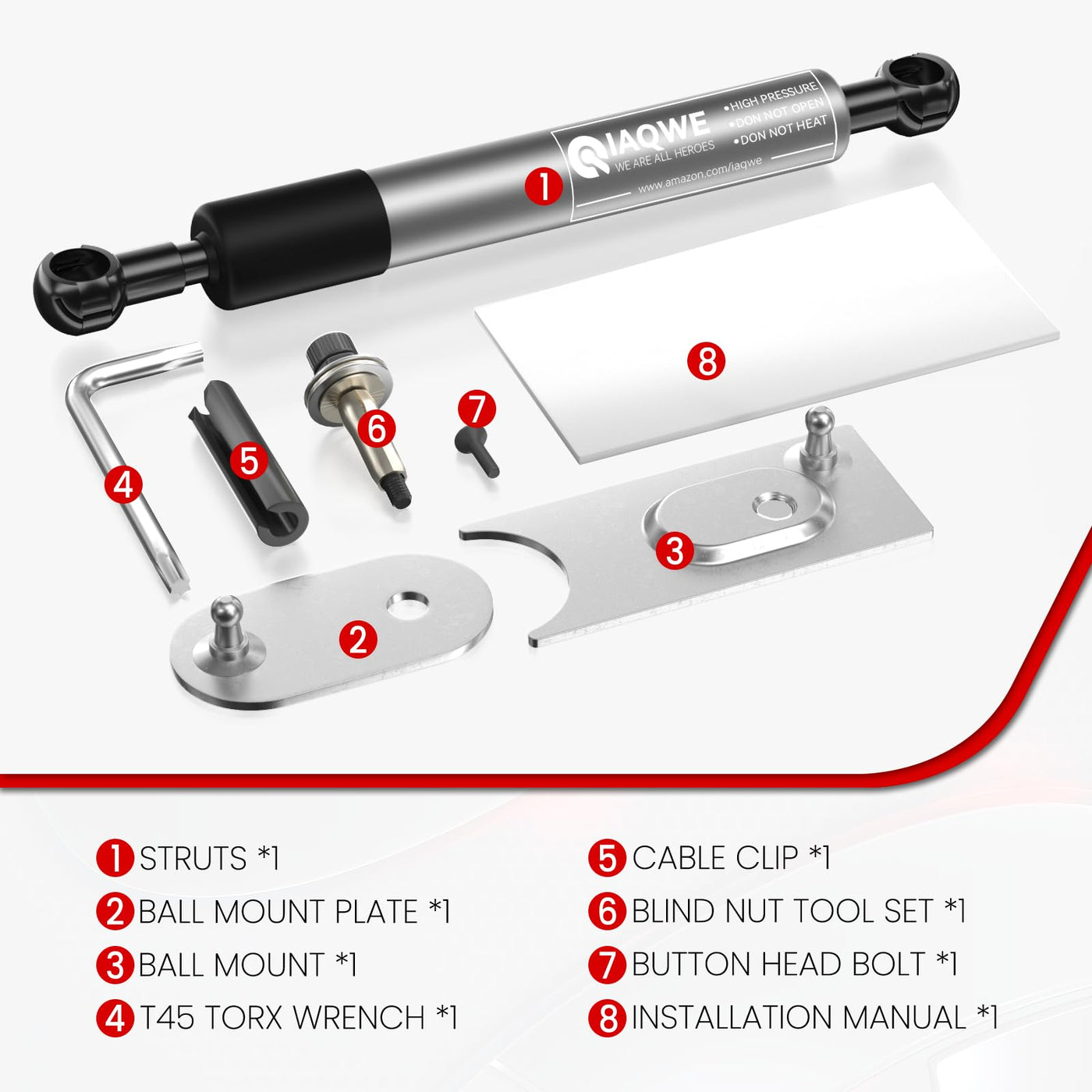 Q: What components are included in the IAQWE Tailgate Assist package?A: The IAQWE Tailgate Assist includes 1x Shock, 1x Ball Mount Plate, 1x Ball Mount, 1x Cable Clip, 1x T45 Torx Wrench, 1x Blind Nut Tool Set, and an Installation Manual for easy setup.