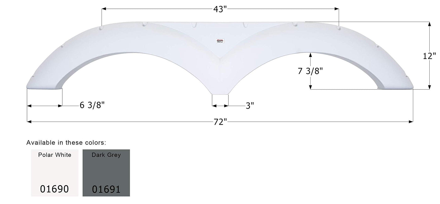 Q: What are the dimensions of the ICON 01690 Fender Skirt?A: The dimensions of the ICON 01690 Fender Skirt are 72 inches in length and 12 inches in width, making it suitable for a variety of trailer applications.