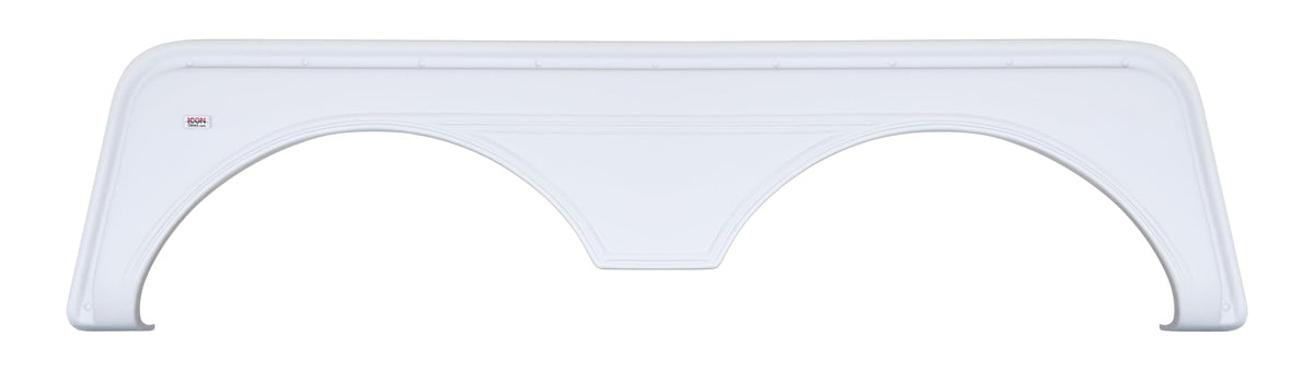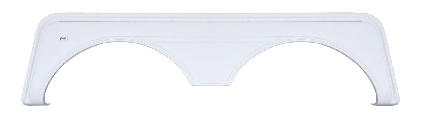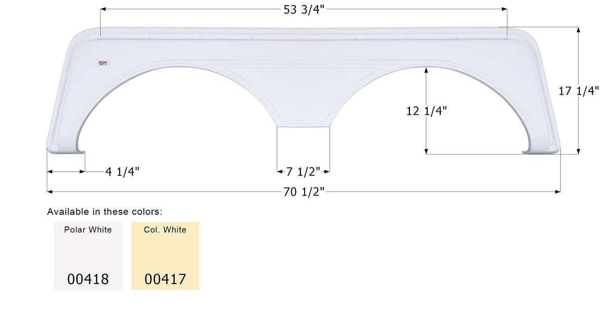 Icon Tandem Axle Fender Skirts are constructed of durable ABS plastic. This replacement tandem axle fender skirt features a textured finish. The FS669 Tandem Axle Fender Skirt is available in polar white and colonial white. The legs of this fender skirt model curve underneath the trailer. The dimensions are 70-1/2'' x 17-1/4''. For more in depth measurements, visit the manufacturer's website for measurement forms.