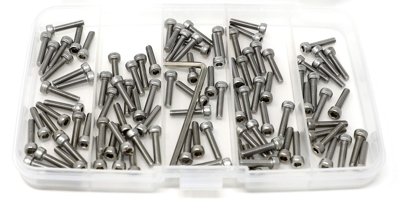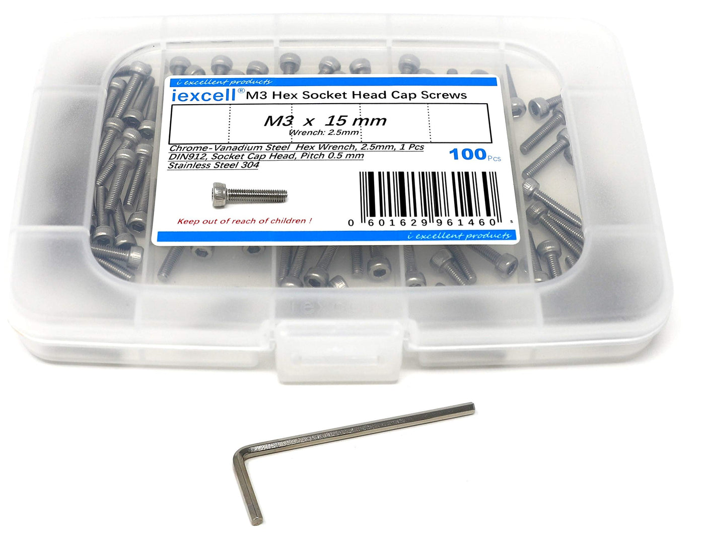 【 iexcell 100 Pcs Metric M3 x 15 Stainless Steel 304 Hex Socket Head Cap Screws Bolts Kit 】 ✔ Includes 100 Pcs M3 x 15 hex socket head cap screws, meets/exceeds DIN912 --Screw head style: socket cap, head diameter: 5.5 mm, head height: 3 mm ; screw drive style: internal hex drives also known as hex socket drives, hex size: 2.5 mm --Thread diameter: 3 mm (2.784mm~2.980mm, tested) , thread pitch: 0.5 mm, length(Head Not Included): 15 mm --M3 x 15 means: Metric Threads, Thread diameter: 3 mm, Length(Head Not Included) 15 mm, Total Length(Head Included): 18 mm --Material: stainless steel 304, high strength and anti-corrosion in various conditions ✔ Includes 1 Pcs hex key, hex size: 2.5 mm, to drive these screws conveniently and easily, material: chrome-vanadium steel, nickel plated, higher strength, anti-rust ✔ Easy to store: these screws and a hex key come in an easy-use storage case