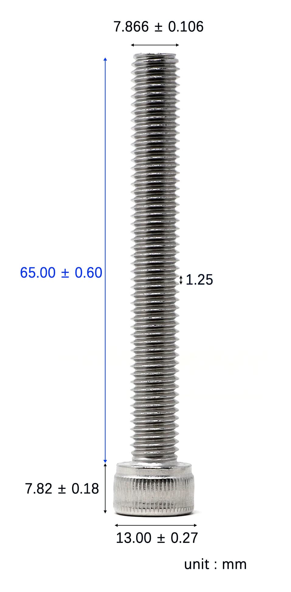 Q: What are the dimensions of the M8 x 65 hex socket head cap screws?A: The M8 x 65 hex socket head cap screws have a thread size diameter of 8 mm, a thread pitch of 1.25 mm, and a thread length of 65 mm. The head diameter is 13.00 mm and the head height is 7.82 mm.