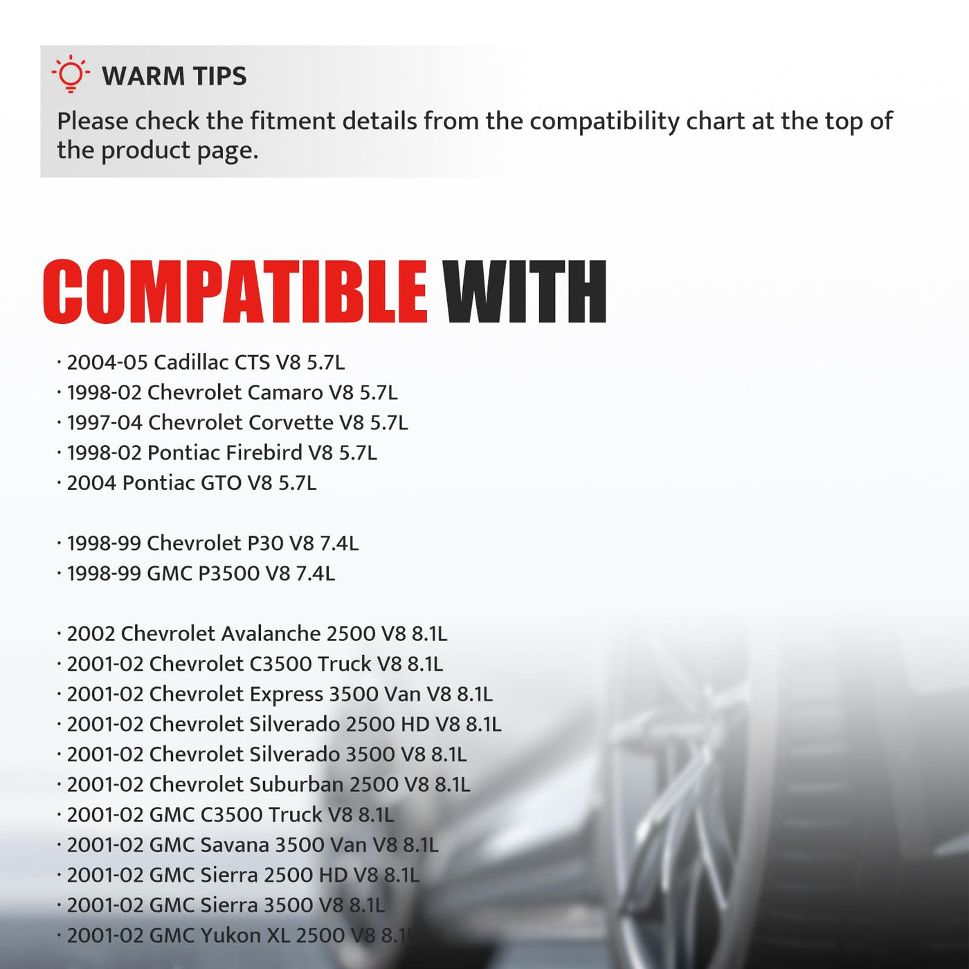 Q: What vehicles are compatible with the Ignition Coil Pack?A: The Ignition Coil Pack is compatible with various V8 engines including 5.7L and 8.1L models from 1998 to 2005. Notable compatible vehicles include the 2004-2005 Cadillac CTS, 1998-2002 Chevy Camaro, Chevy Corvette (97-04), Pontiac Firebird (1998-2002), and various GMC models such as the Sierra and Yukon XL.