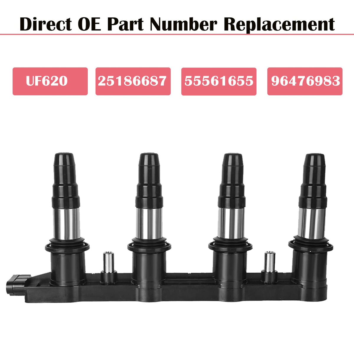 Q: What are the replacement part numbers for the LCWRGS Ignition Coil Pack?A: The LCWRGS Ignition Coil Pack replaces several OEM part numbers including C1646, UF620, IC723, UF-620, 96476983, 55561655, 55571790, 55571845, and 25186687. Make sure to verify these part numbers with your existing coil to ensure proper fit.