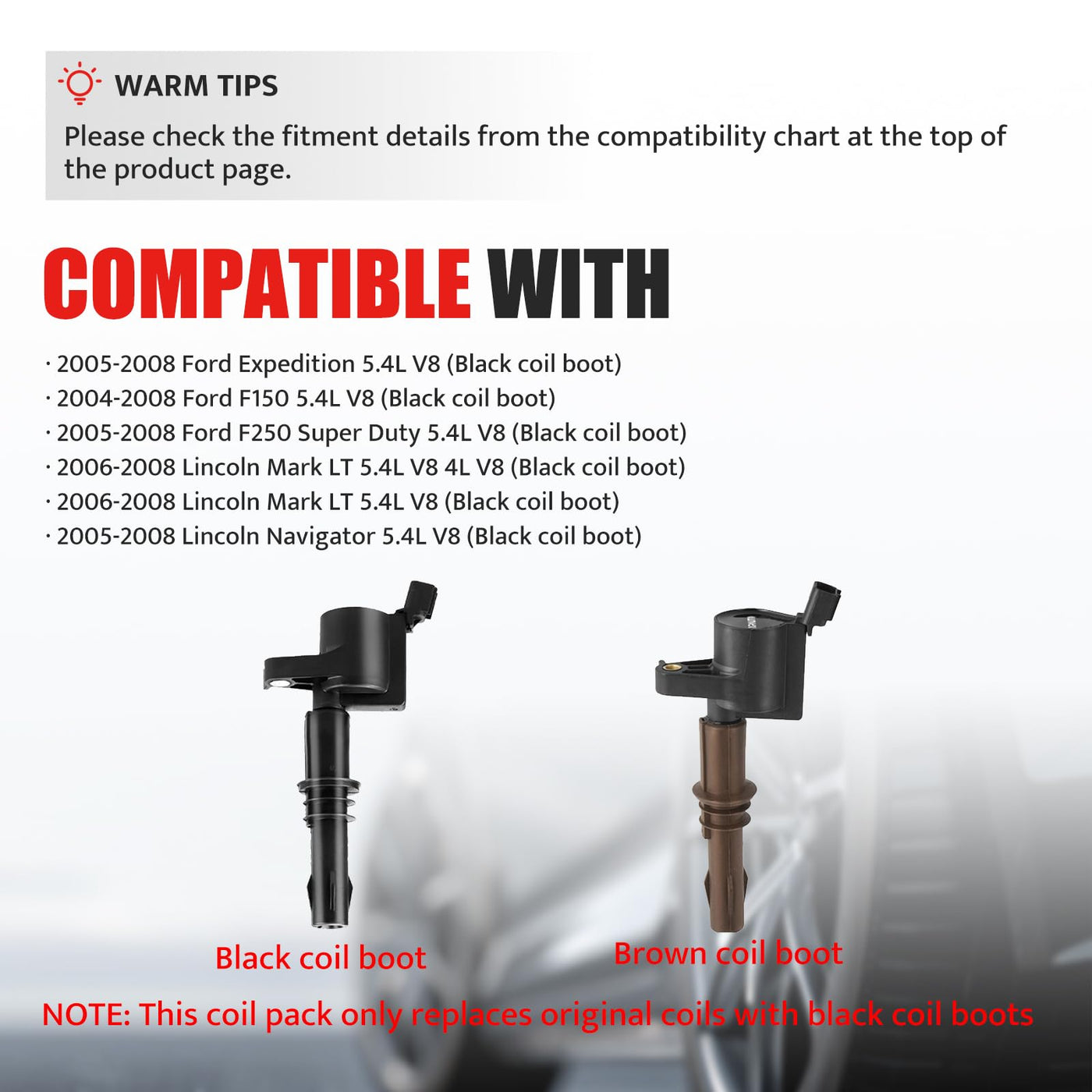 Q: What vehicles are compatible with the NPAUTO ignition coil pack and spark plugs?A: The NPAUTO ignition coil pack and spark plugs are compatible with various Ford and Lincoln vehicles including the 2004-2008 Ford F-150, 2005-2008 Ford F-250 and F-350 Super Duty, 2005-2008 Ford Expedition, 2005-2008 Lincoln Navigator, and the 2006-2008 Lincoln Mark LT. Always check the compatibility chart before purchase to ensure a proper fit.