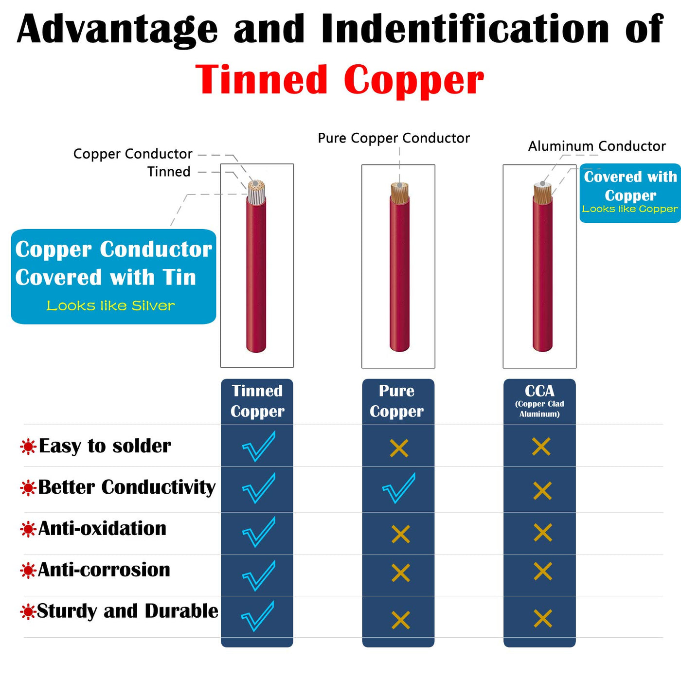 Q: What gauge wire is used in this cable?A: This cable uses ten gauge wire. It is made from tinned copper, ensuring durability and efficiency for power transfer.
