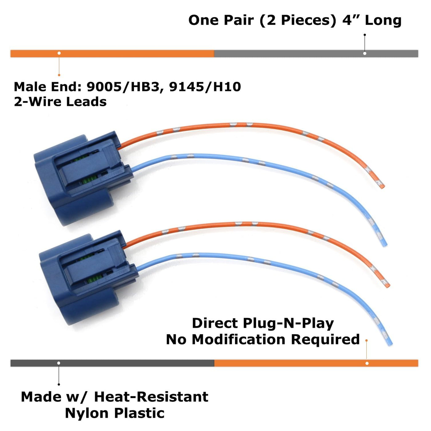 This page features a brand new set of iJDMTOY (2) OEM 9005 HB3 H10 9145 Female Adapters Wiring Harness Sockets w/ 4-Inch Wire Pigtails Compatible With Headlights or Fog Lights Use.