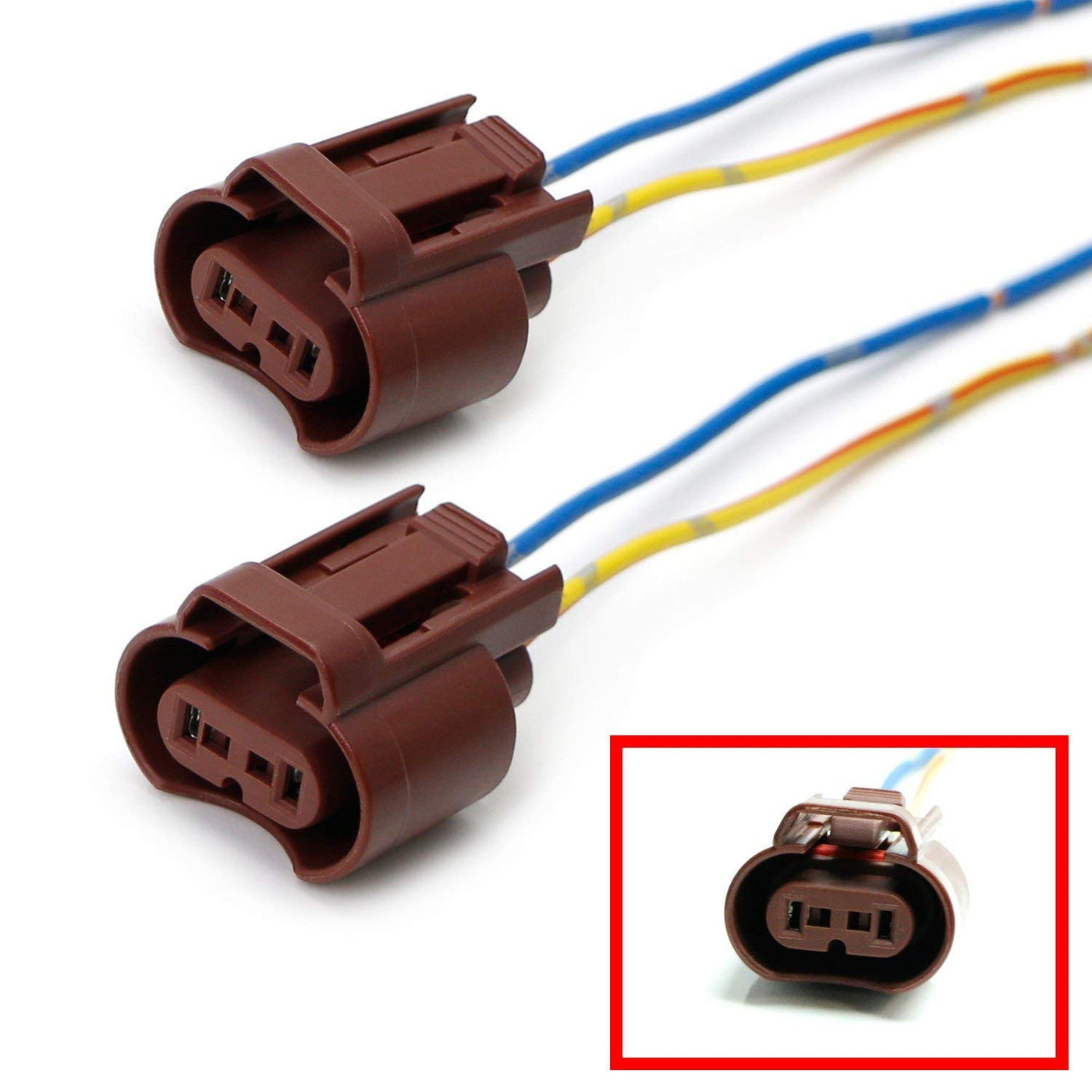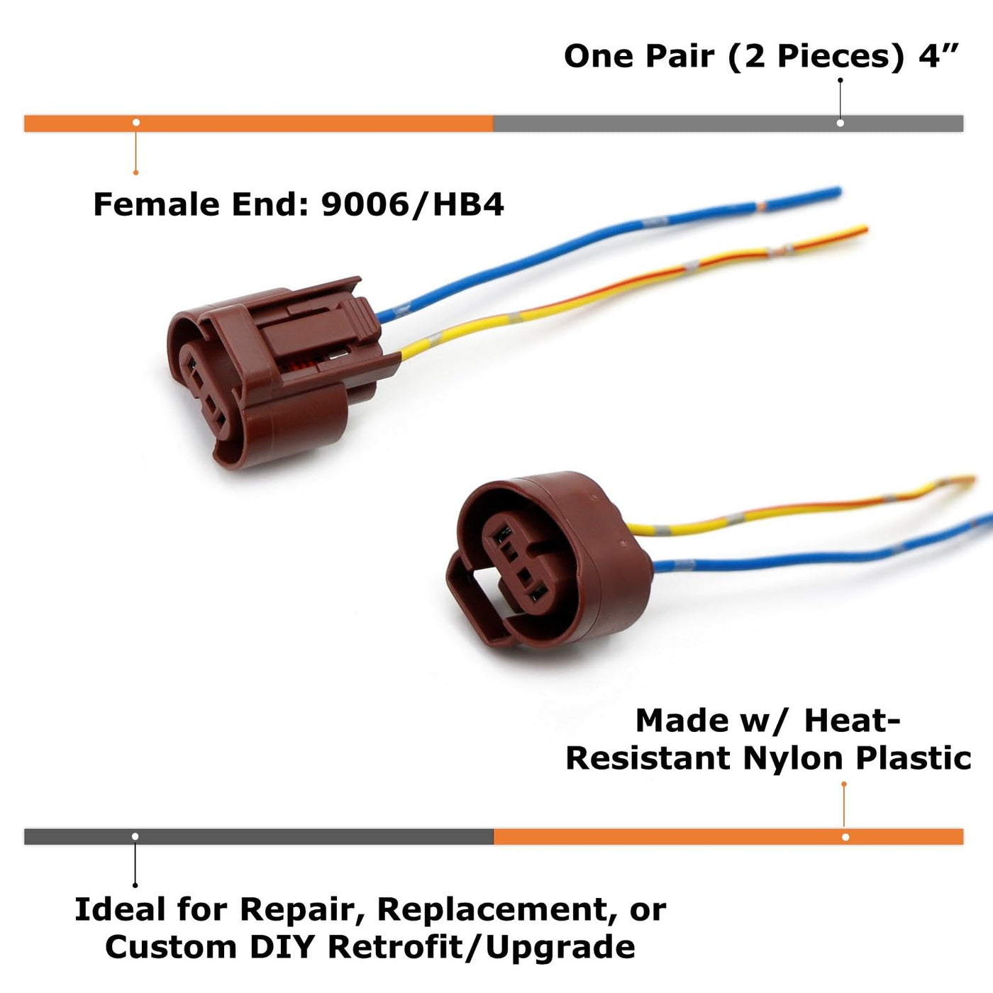This page features a brand new set of iJDMTOY (2) OEM 9006 HB4 Female Adapters Wiring Harness Sockets w/ 4-Inch Wire Pigtails Compatible With Headlights or Fog Lights Use.